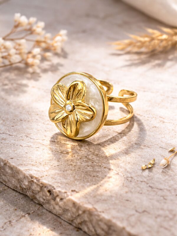 La bague rotative Lyséa allie délicatesse et élégance avec son motif floral doré posé sur un médaillon nacré lumineux. Inspirée des fleurs en pleine éclosion, elle apporte une touche douce et raffinée à chaque tenue. Son anneau rotatif ajoute une dimension ludique et apaisante, faisant de ce bijou un véritable coup de cœur, à la fois tendance et intemporel.