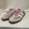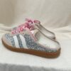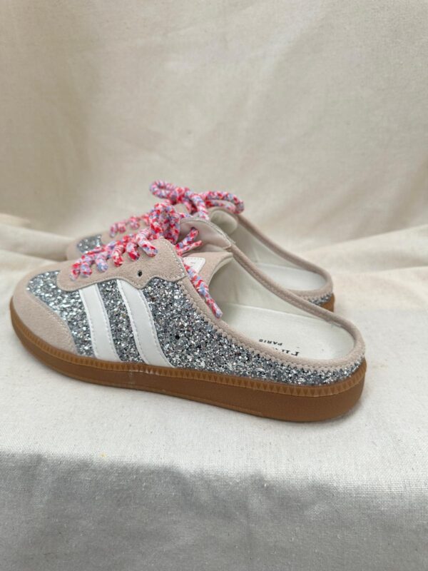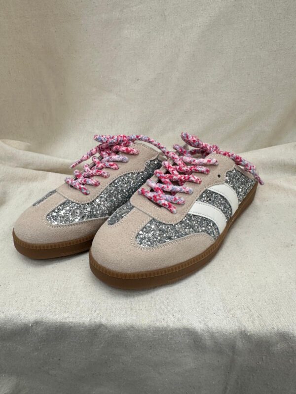 Les baskets Bianca attirent tous les regards avec leur mélange audacieux de brillance et de douceur. Ce modèle associe des empiècements beige effet suédé à une base entièrement pailletée pour une allure lumineuse et ultra tendance. Les bandes latérales blanches structurent la silhouette tandis que les lacets tressés rose et blanc apportent une touche fun et originale. La semelle gomme esprit rétro assure confort et stabilité au quotidien. Un modèle parfait pour twister vos looks avec éclat.