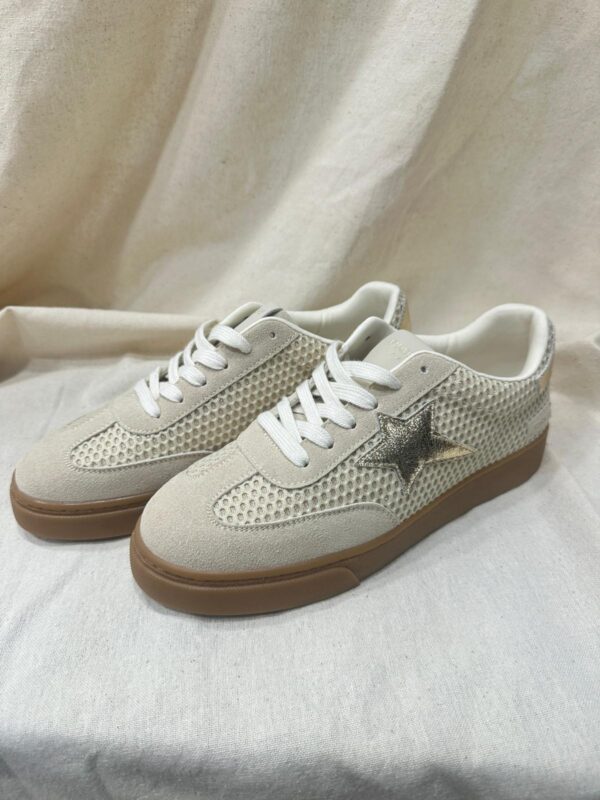 Les baskets Chiara allient modernité et légèreté avec une touche lumineuse. Confectionnées dans une matière ajourée effet mesh beige, elles offrent un style aérien parfait pour la saison. L’étoile latérale métallisée apporte une note chic et subtilement brillante, tandis que la semelle gomme esprit rétro assure confort et stabilité au quotidien. Un modèle facile à porter, idéal pour un look casual raffiné.