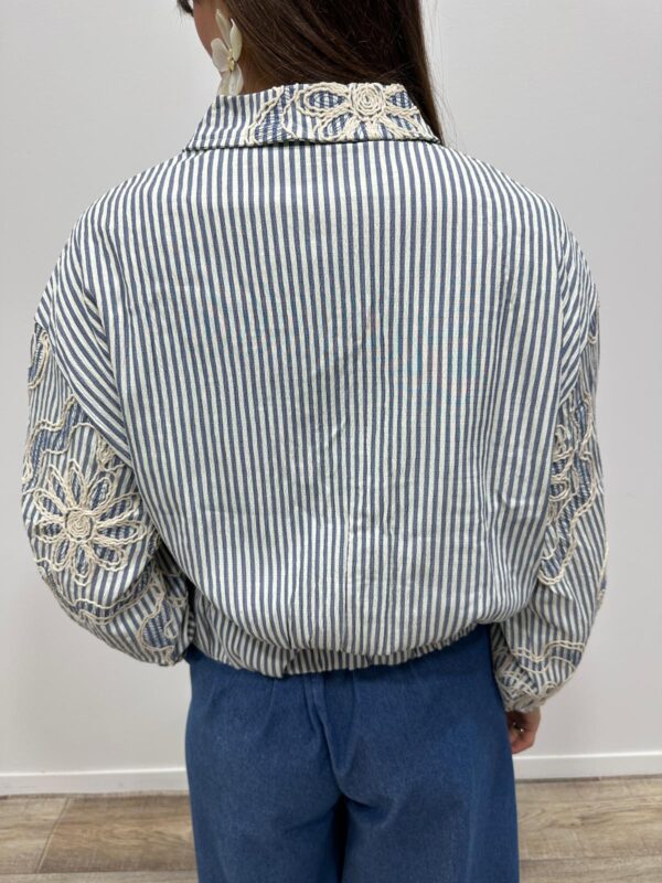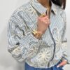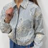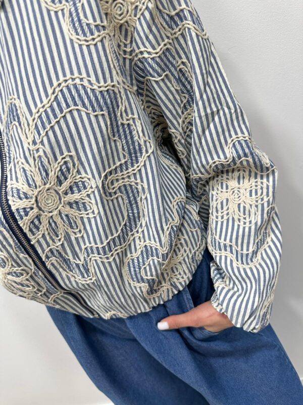 Craquez pour cette veste légère au charme bohème chic, une pièce originale qui allie élégance et caractère 💫🤍 Son tissu rayé bleu et blanc est sublimé par de magnifiques broderies florales contrastées, qui apportent relief et raffinement. Sa coupe courte et sa fermeture zippée lui donnent une allure moderne et facile à porter, idéale pour structurer une tenue tout en douceur. Une veste coup de cœur, parfaite pour la mi-saison et pour rehausser un look simple avec style ✨🌿