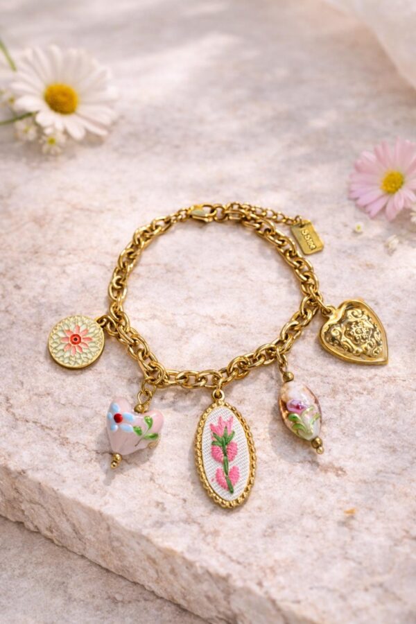 Le bracelet Rosabella incarne un univers romantique et délicatement fleuri. Sa chaîne dorée est sublimée par une sélection de charms raffinés aux motifs floraux et cœurs précieux, créant un bijou à la fois doux, féminin et plein de poésie.