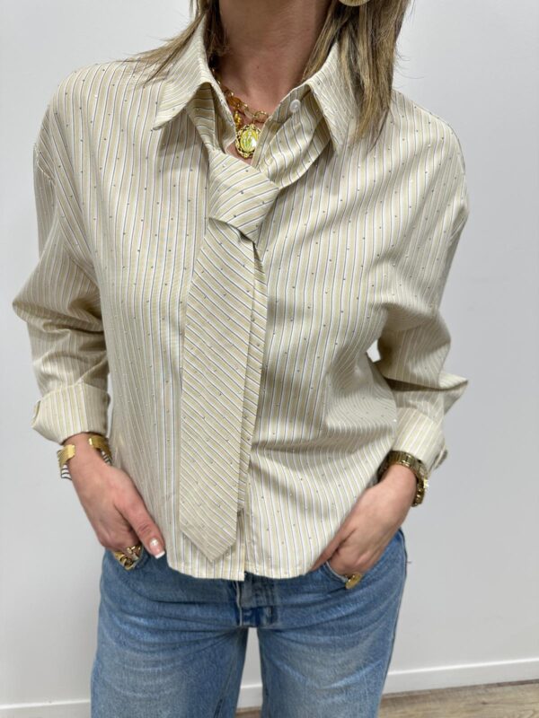 La chemise chic & tendance ✨ Un modèle ultra élégant revisité avec une touche mode grâce à sa cravate intégrée. On adore ses fines rayures délicates et ses petits détails brillants qui captent subtilement la lumière 🤍 Parfaite pour un look sophistiqué, elle apporte instantanément du caractère à votre tenue.