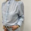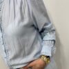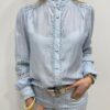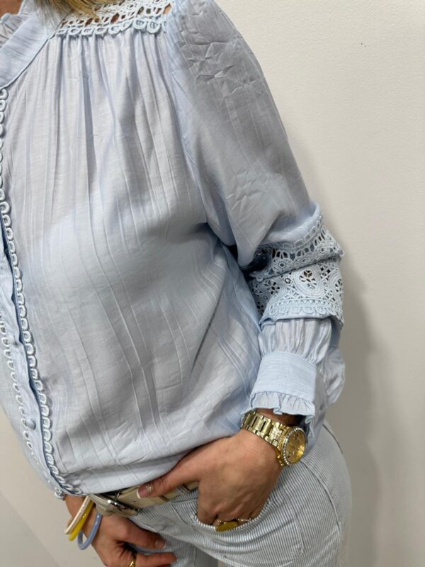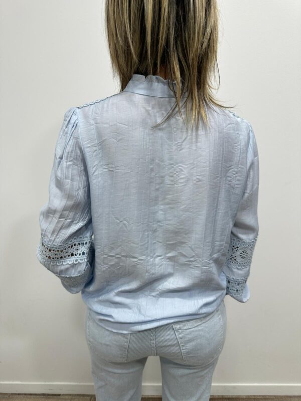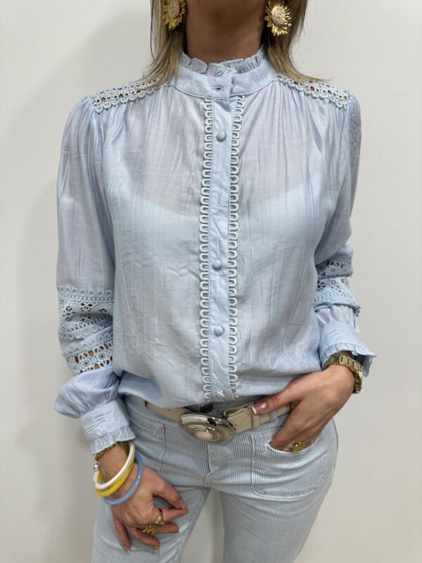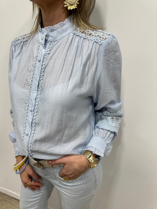 Laissez-vous séduire par cette chemise élégante et délicatement travaillée, parfaite pour apporter une touche féminine et raffinée à votre tenue. Son col légèrement montant volanté et ses détails en dentelle sur les épaules et les manches lui donnent un charme romantique et sophistiqué. Sa matière légère et fluide offre un tombé élégant, idéal pour un look chic au quotidien comme pour une occasion plus habillée.