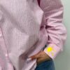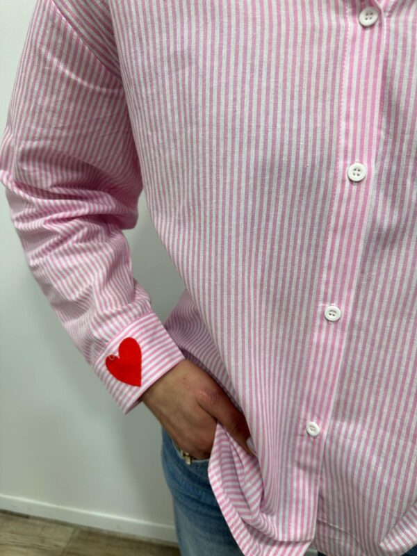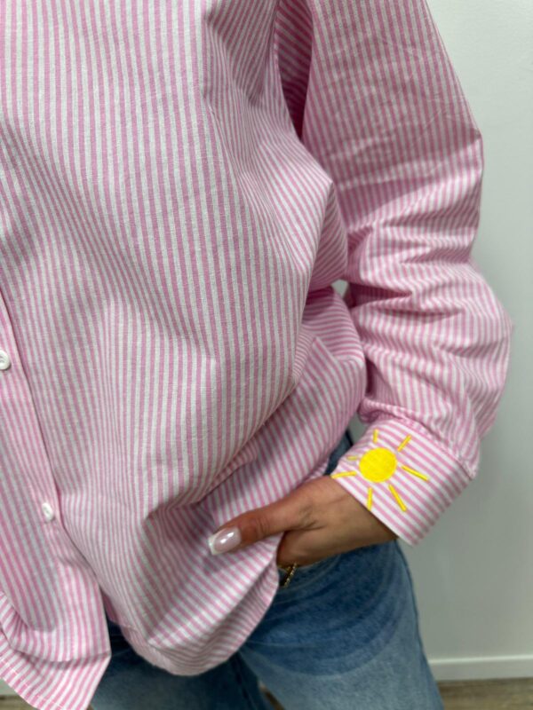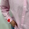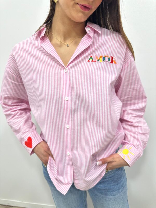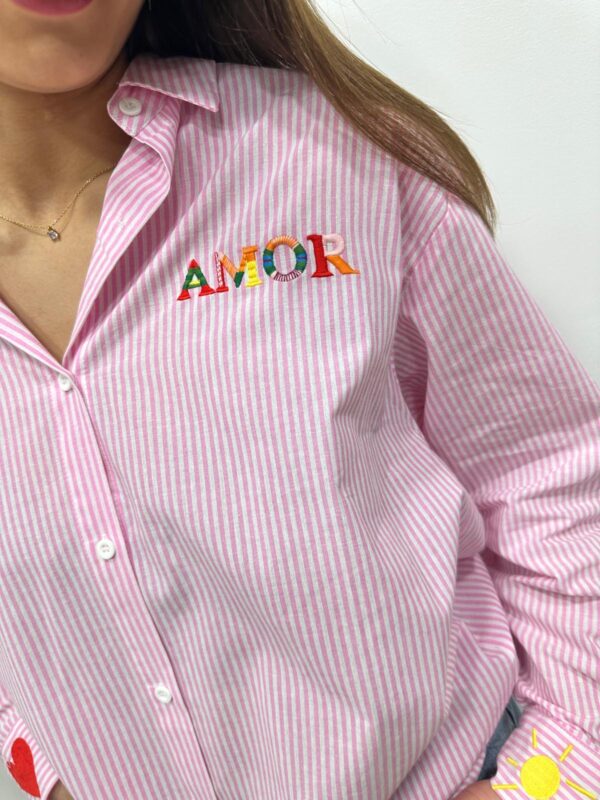 Originale et pleine de pep’s, cette chemise à rayures roses se distingue par ses broderies colorées qui lui donnent un style unique. Le détail « AMOR » brodé apporte une touche fun et tendance, tandis que les petits motifs sur les poignets ajoutent du charme à la pièce. Une chemise idéale pour dynamiser un look casual 💖