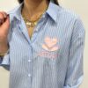 La chemise rayée “Amour”. On adore sa couleur lumineuse rehaussée de fines rayures et surtout son joli détail cœur avec l’inscription “amour” brodée sur la poitrine 🤍 Une pièce à la fois tendance et féminine qui apporte une touche douce et moderne à vos looks du quotidien. Parfaite pour une silhouette plus structurée ✨