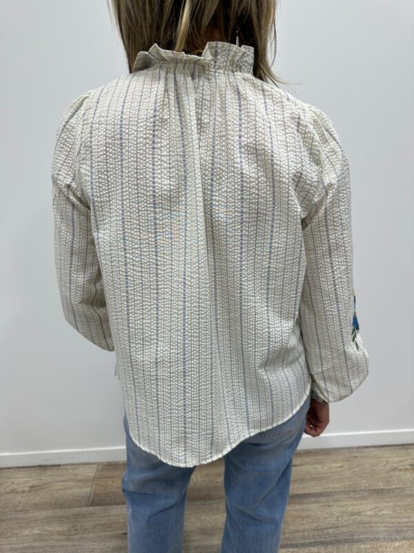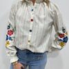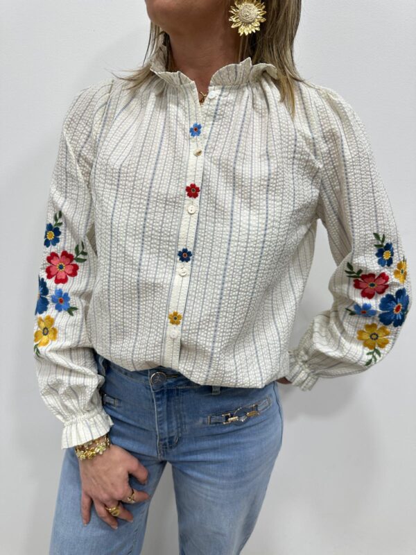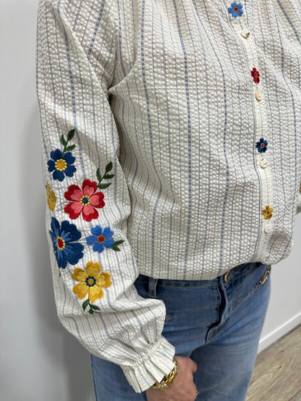 La chemise bohème pleine de charme 🌸🤍 On craque pour cette chemise délicatement texturée, sublimée par de fines rayures et de superbes broderies florales colorées sur les manches. Son col légèrement volanté apporte une touche romantique et élégante, parfaite pour un look féminin et raffiné ✨ Facile à associer, elle illumine instantanément votre tenue.