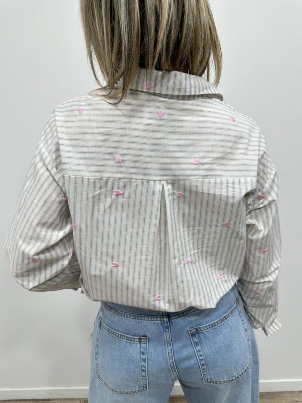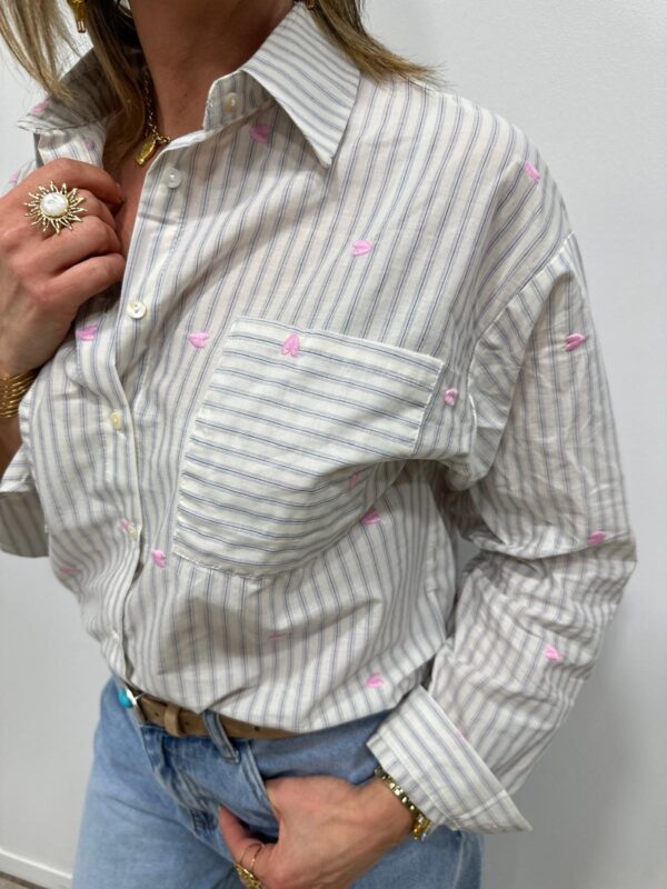 Cette chemise rayée revisite le style classique avec une touche délicate et moderne. Ses fines rayures sont sublimées par de petits cœurs brodés qui apportent une note subtilement romantique. Facile à associer pour un look casual chic, elle deviendra rapidement un incontournable de votre dressing