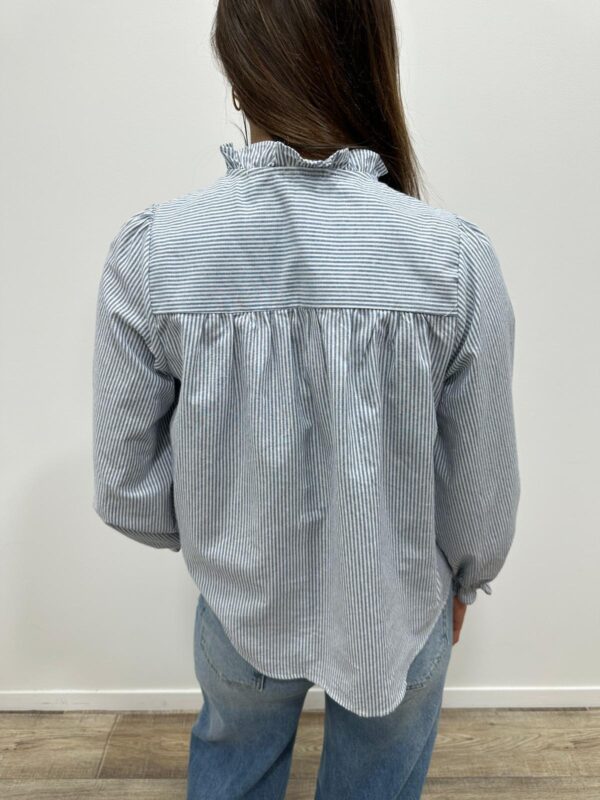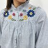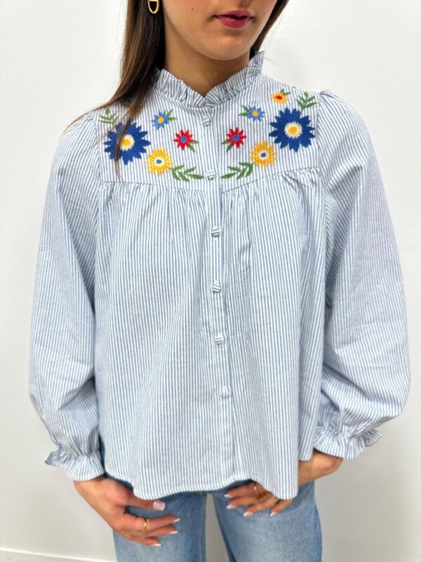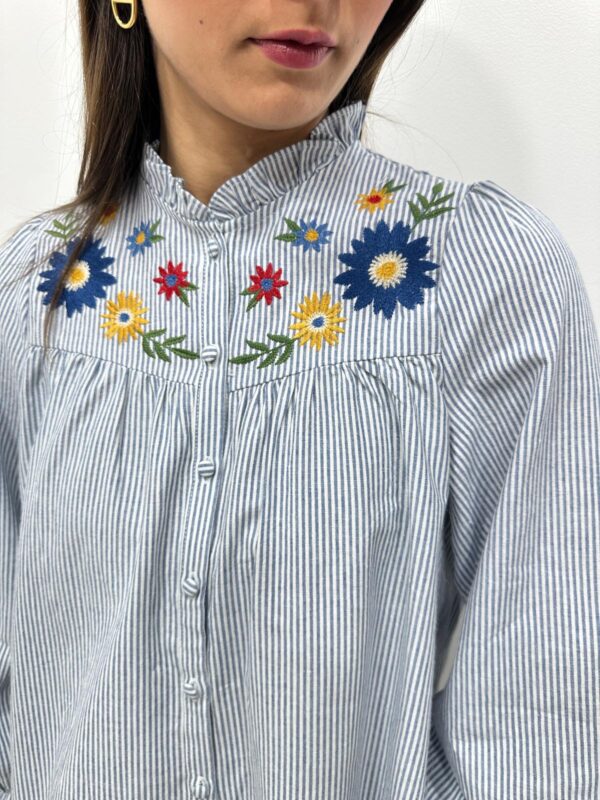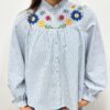 Cette ravissante chemise rayée apporte une touche fraîche et colorée à votre dressing. Son joli col volanté et ses broderies florales multicolores sur le buste lui donnent un charme bohème et féminin. Facile à porter, elle illumine instantanément votre tenue