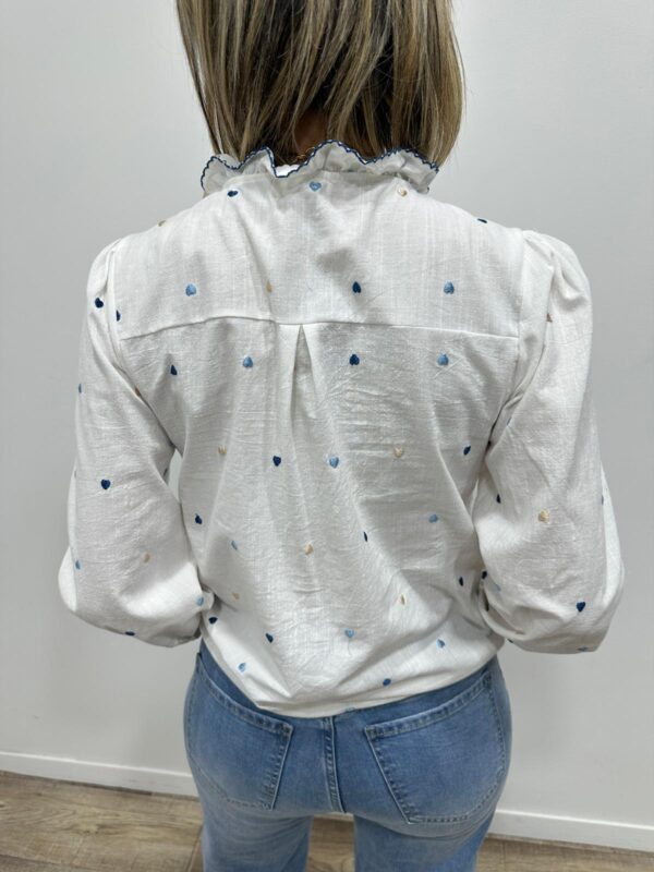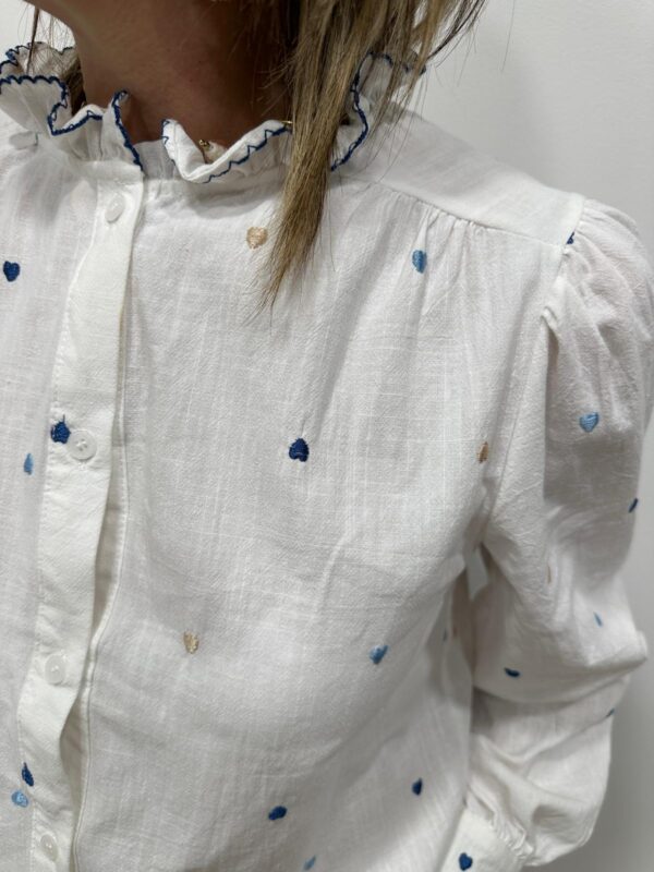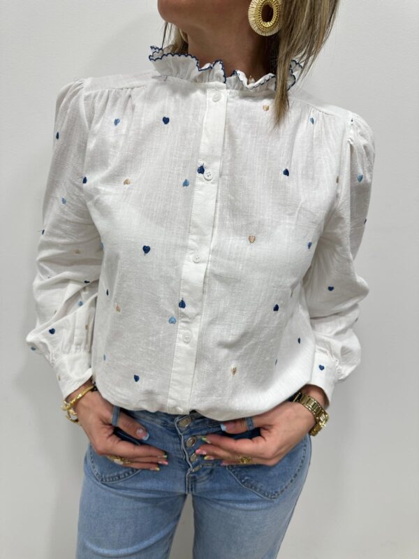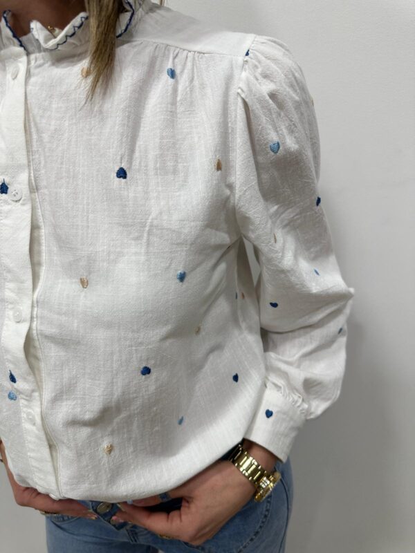 Craquez pour cette chemise pleine de charme aux délicates broderies en forme de petits cœurs. Son col volanté souligné d’un liseré contrasté apporte une touche romantique et originale à la pièce. Légère et élégante, elle est facile à porte pour un look moderne 🤍