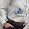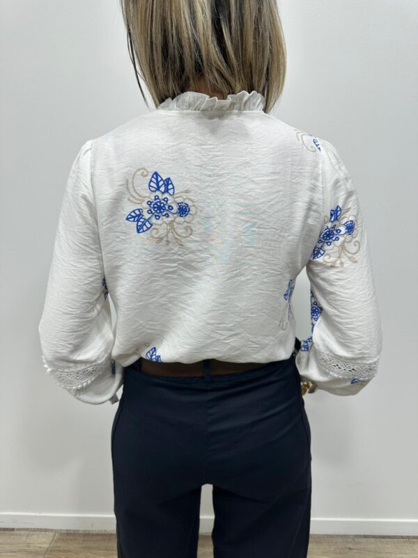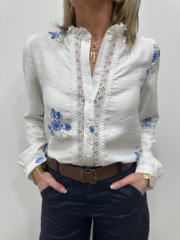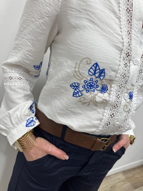 Un charme délicat et raffiné 🤍✨Cette chemise blanche séduit par ses magnifiques broderies bleues et ses détails en dentelle qui apportent une touche romantique et élégante. On adore son col légèrement volanté, sa patte de boutonnage ornée de dentelle et ses manches subtilement travaillées. Une pièce idéale pour un look chic sans effort.