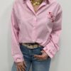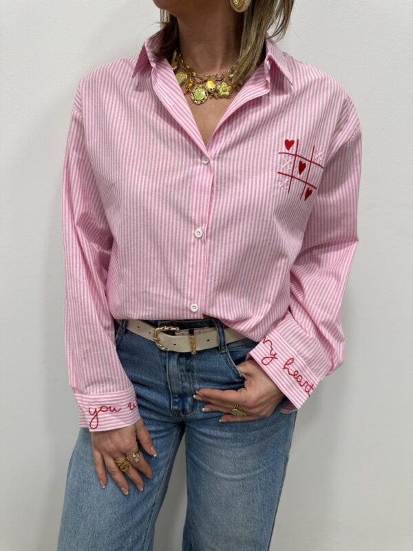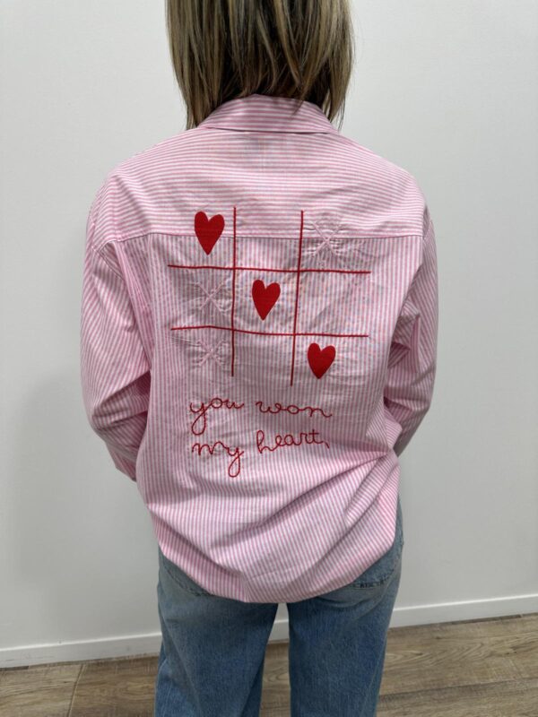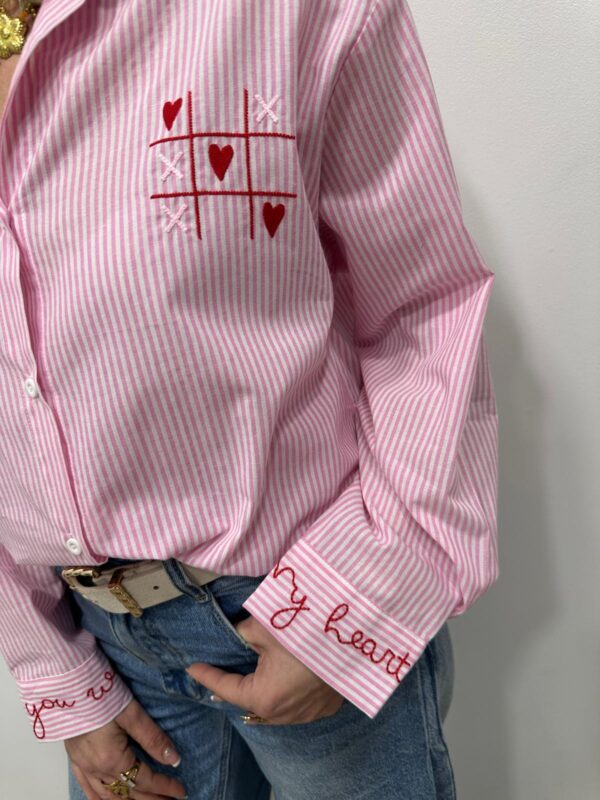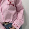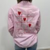 La chemise fun et pleine d’amour ❤️ Avec ses fines rayures rose et blanc et ses broderies originales en forme de morpion revisité avec des cœurs, cette chemise apporte une touche ludique et tendance à votre look. On adore le détail brodé au dos avec son message romantique qui fait toute la différence ✨ Parfaite pour un look casual chic ou un style plus moderne.