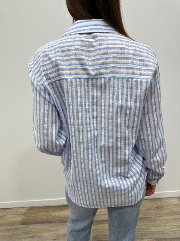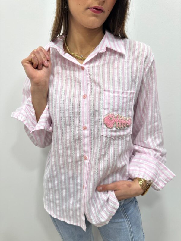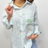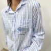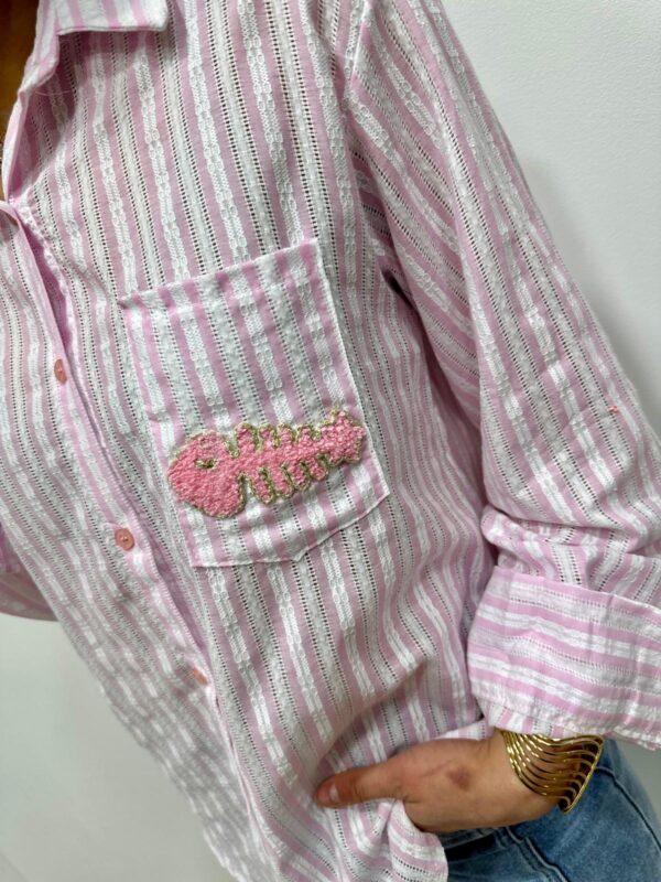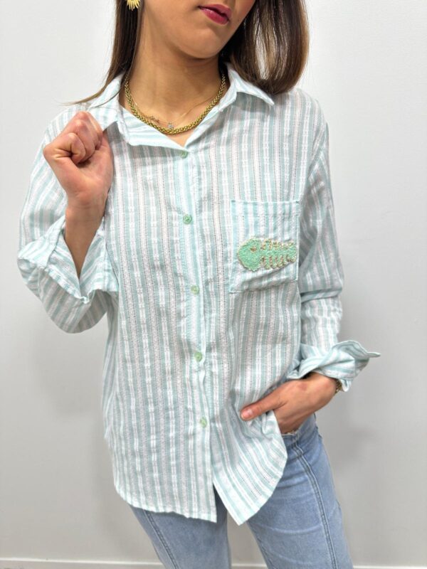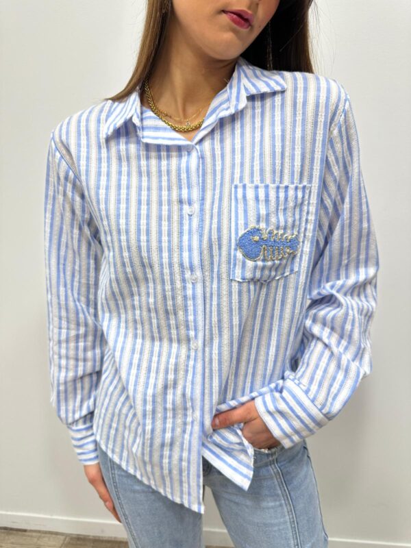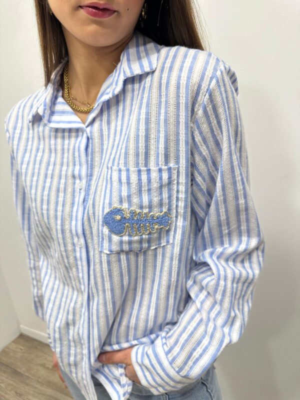 La chemise rayée revisitée avec une touche fun 🐟💙 Avec ses fines rayures bleu et blanc et son petit motif poisson brodé sur la poche, elle apporte une note originale tout en restant chic et facile à porter. On adore sa coupe fluide et son esprit casual pour un look frais et lumineux ✨