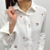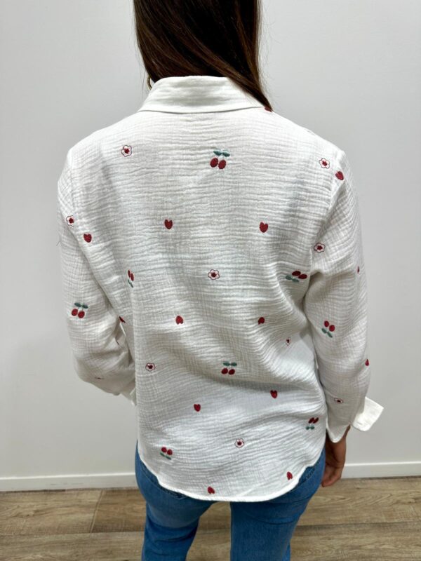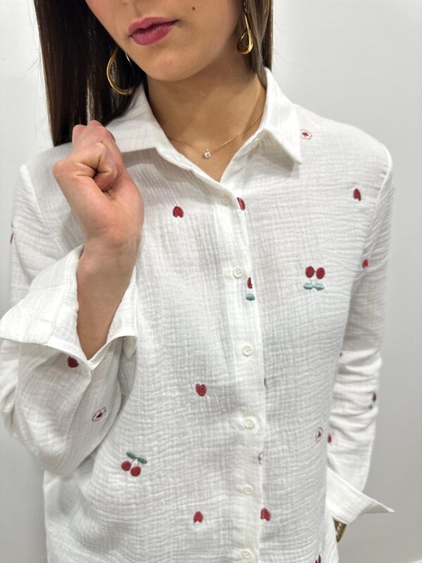La chemise blanche revisitée, douce et pleine de charme 🍒🤍 On adore sa matière légère et texturée qui apporte du relief tout en restant confortable. Ses petites broderies délicates (cerises et cœurs) ajoutent une touche romantique et originale à ce basique intemporel. Parfaite pour un look casual chic. 🌸