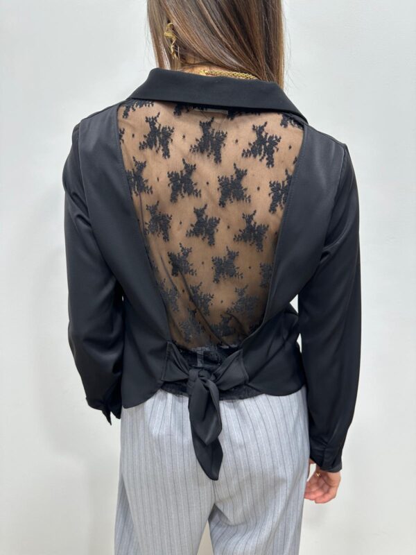 La chemise noire revisitée… avec un détail qui fait toute la différence 🖤✨ À l’avant, une coupe élégante et minimaliste. À l’arrière, un sublime jeu de transparence en dentelle florale qui dévoile délicatement le dos, sublimé par un joli nœud à nouer. Une pièce chic, féminine et résolument moderne. Parfaite pour une tenue de soirée ou pour twister un look plus classique avec une touche glamour.