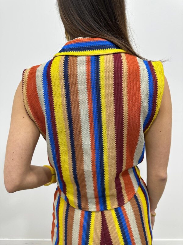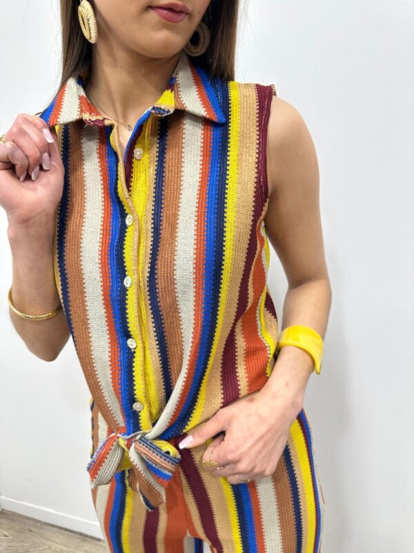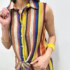 Cette chemise sans manches en maille attire immédiatement le regard grâce à ses rayures colorées et son esprit estival. Son col et sa fermeture boutonnée apportent une touche structurée tandis que le lien à nouer à l’avant souligne joliment la silhouette. La maille légère offre un rendu texturé qui donne du caractère à la pièce. Un modèle original et lumineux qui apporte une vraie touche de style au dressing 🌈