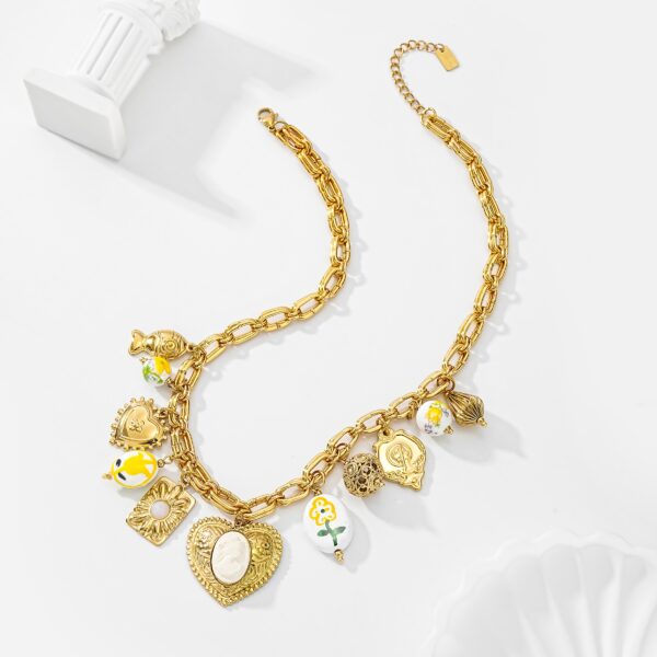 Le collier Léonora est une véritable ode à la Méditerranée. Sa chaîne dorée structurée accueille une multitude de charms délicats : cœurs précieux, coquillage, poisson, médaillons travaillés et touches colorées florales. Chaque détail raconte une histoire et apporte une dimension solaire et romantique au bijou.