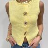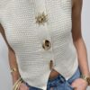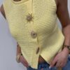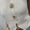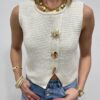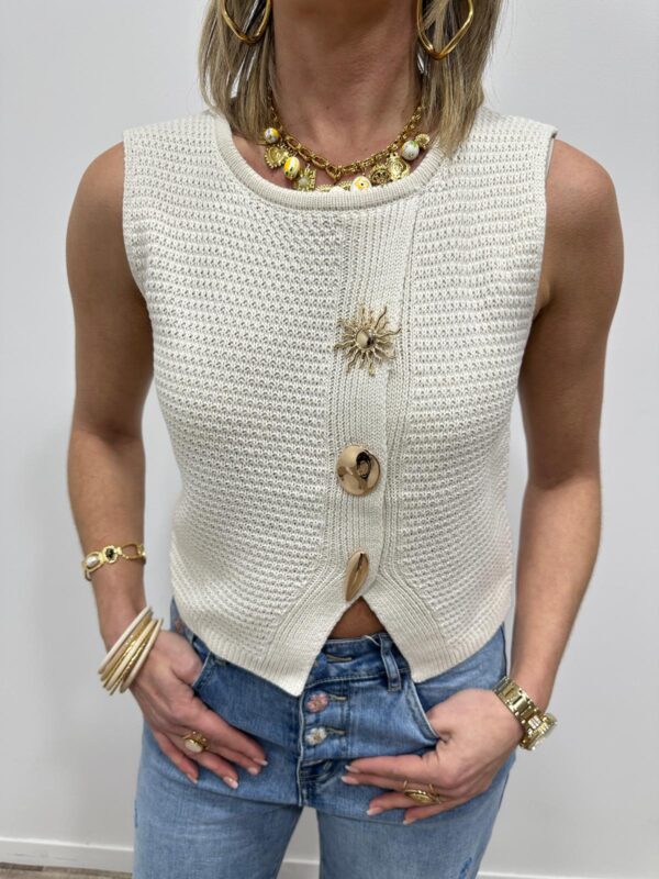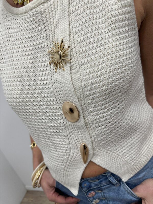 Craquez pour ce joli gilet sans manches en maille, une pièce lumineuse et élégante qui apporte instantanément du style à vos tenues. Sa maille délicatement texturée et sa coupe féminine en font un indispensable facile à porter, aussi bien seul qu’en superposition.On adore ses boutons bijoux dorés au design solaire, véritables détails chic qui font toute la différence. Porté sur une blouse, un tee-shirt ou à même la peau pour un look plus audacieux, ce gilet s’adapte à toutes vos envies, du casual au plus habillé.Une pièce tendance et raffinée, parfaite pour sublimer vos looks de saison ✨