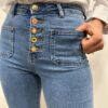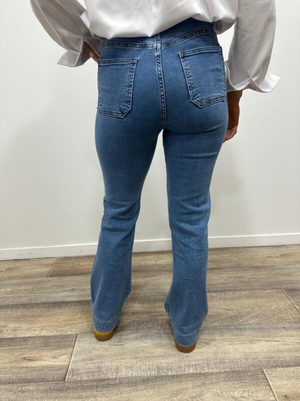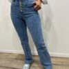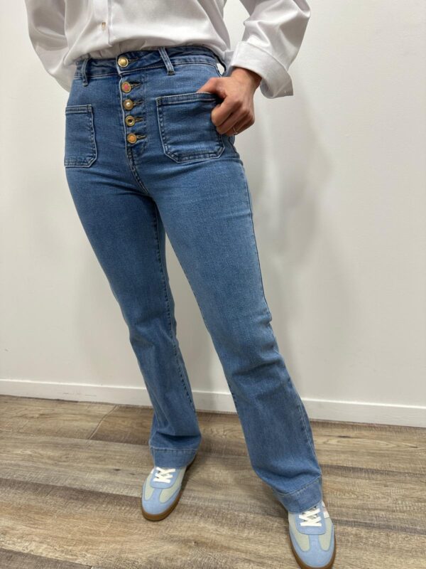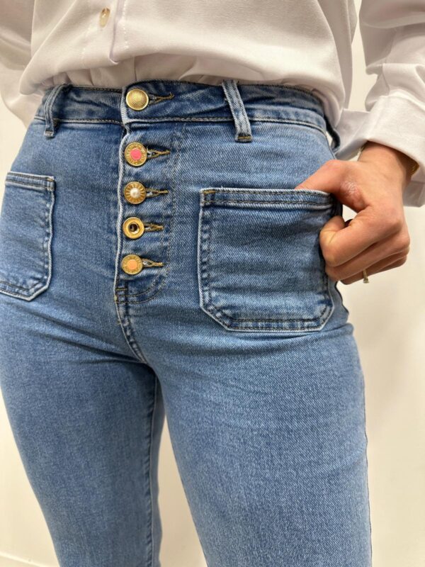 Le jean rétro-chic qui sublime la silhouette 💙✨ On adore sa taille haute flatteuse et sa rangée de boutons dorés qui apportent une touche originale et élégante. Ses poches plaquées sur le devant accentuent l’esprit vintage tandis que sa coupe légèrement évasée allonge visuellement la jambe. Un indispensable facile à associer pour un look féminin et tendance 👖