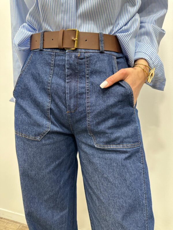 Adoptez une allure moderne et structurée avec ce jean taille haute à la coupe large ultra tendance. Ses grandes poches plaquées sur le devant apportent une touche chic et originale, tandis que sa coupe fluide allonge la silhouette. Facile à associer, c’est la pièce idéale pour un look casual sophistiqué.