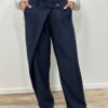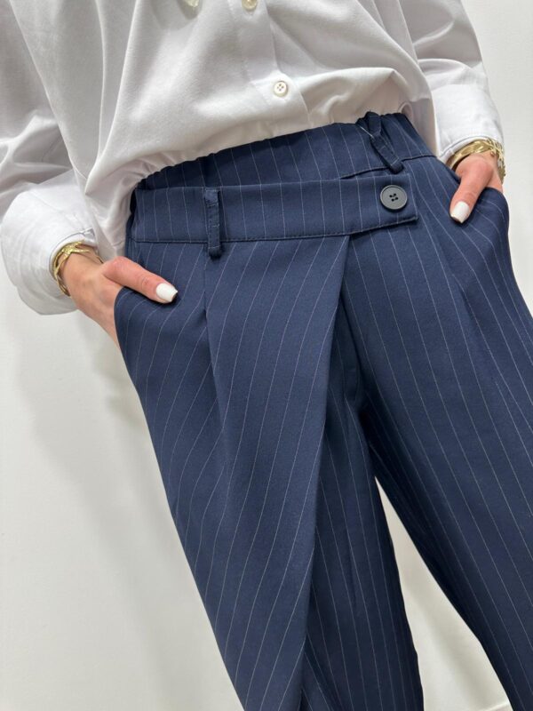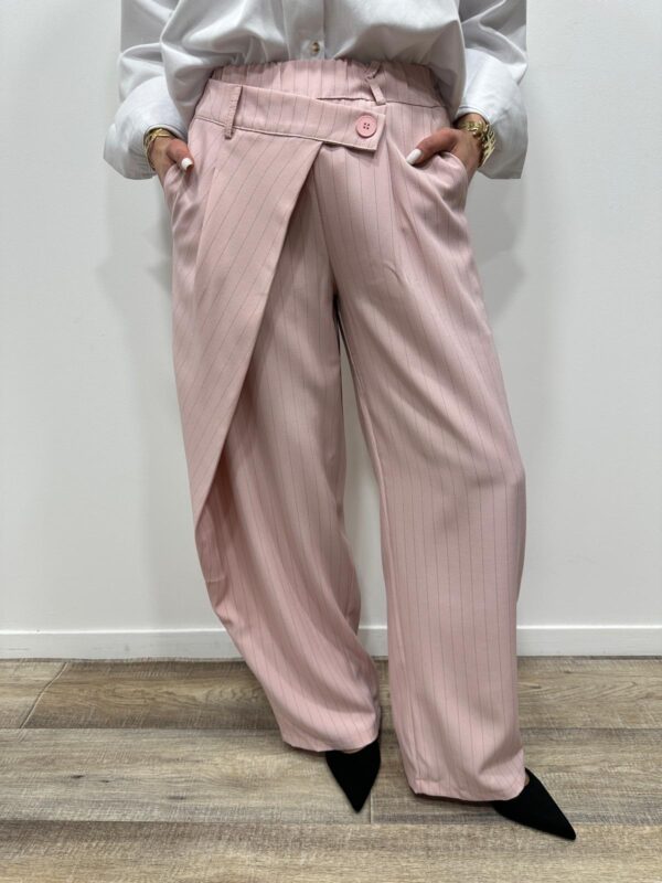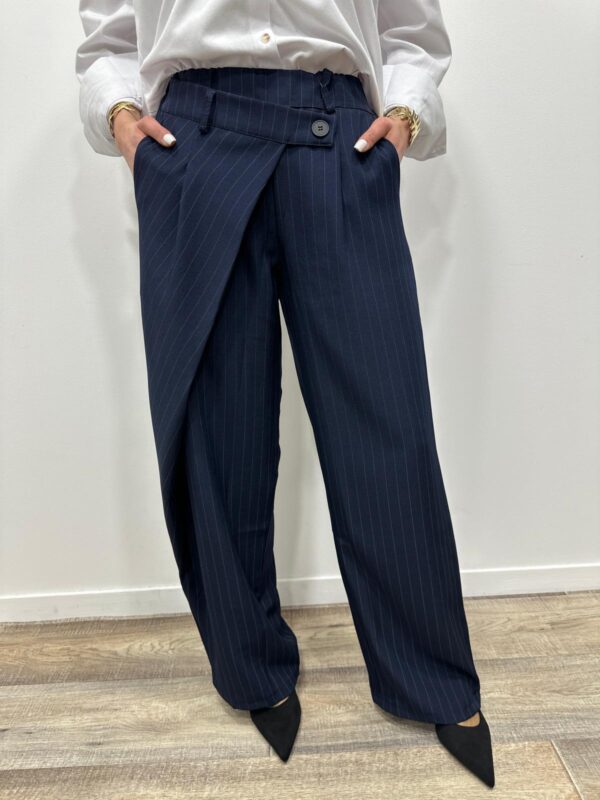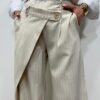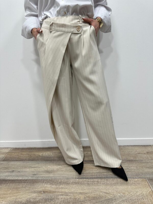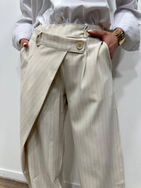 Craquez pour ce pantalon large à rayures, à la fois chic et moderne. Sa coupe fluide et son détail portefeuille sur le devant apportent une touche originale et structurée à la silhouette. Il est parfait pour un look élégant au quotidien comme en soirée.