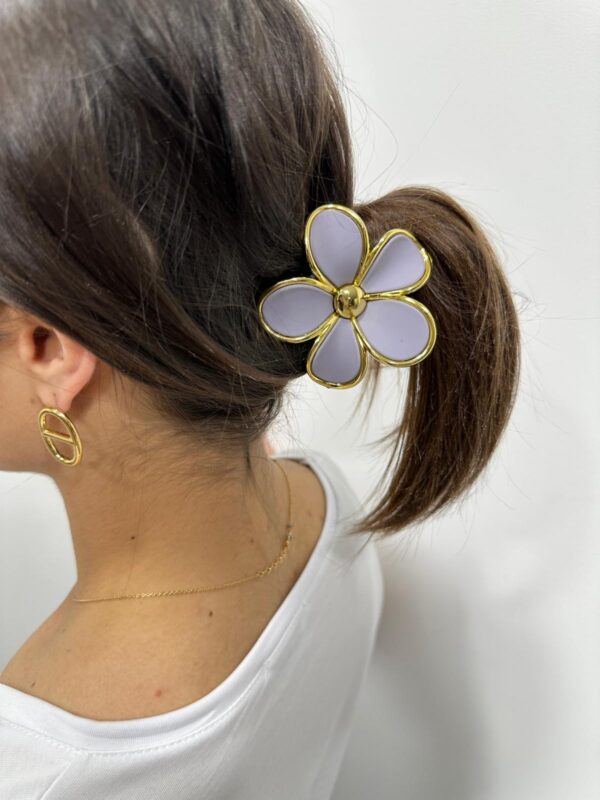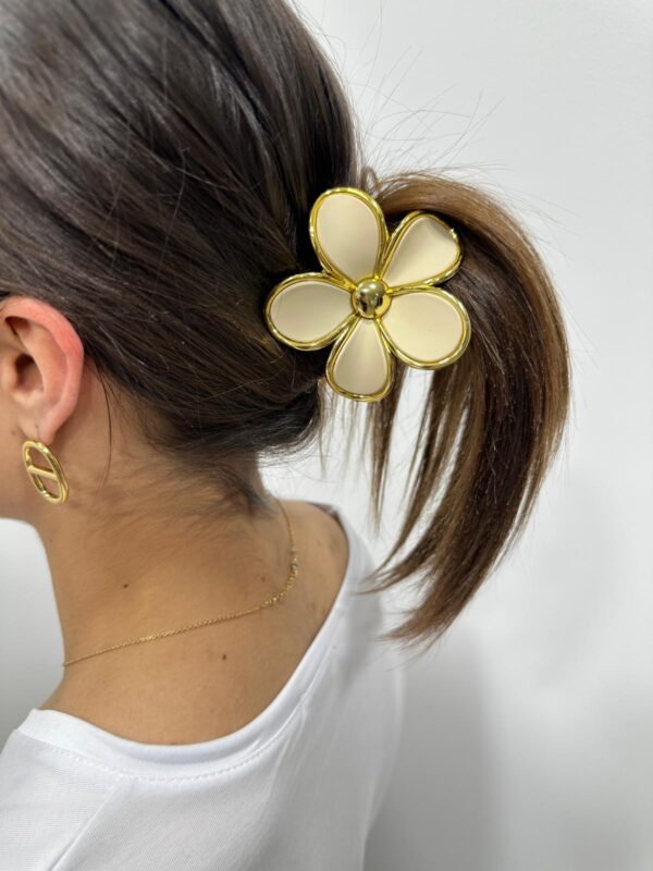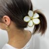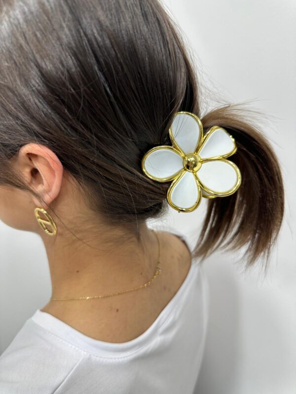 La pince Iloa sublime la coiffure avec son élégante fleur blanche bordée d’or. Son design lumineux et féminin apporte une touche de douceur et de fraîcheur à toutes les coiffures, du simple chignon à la queue de cheval.