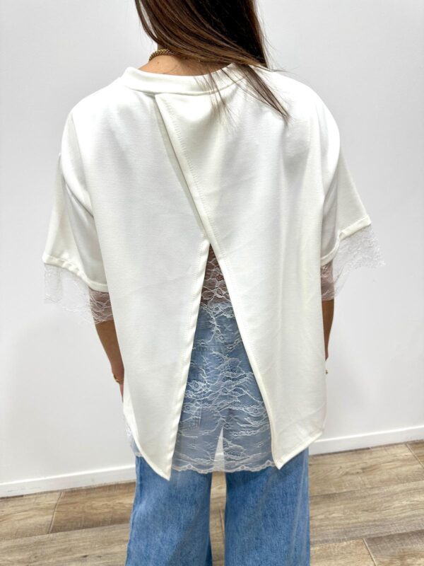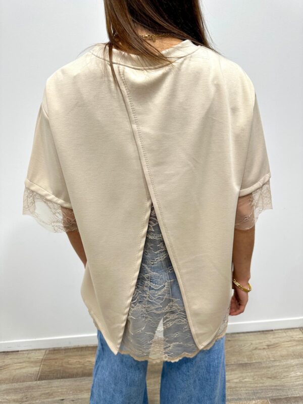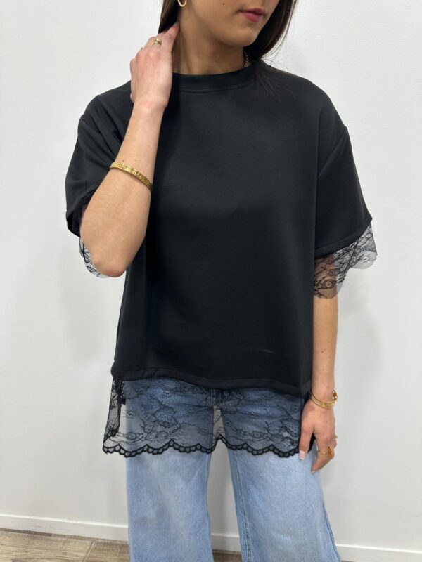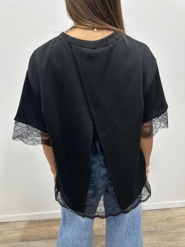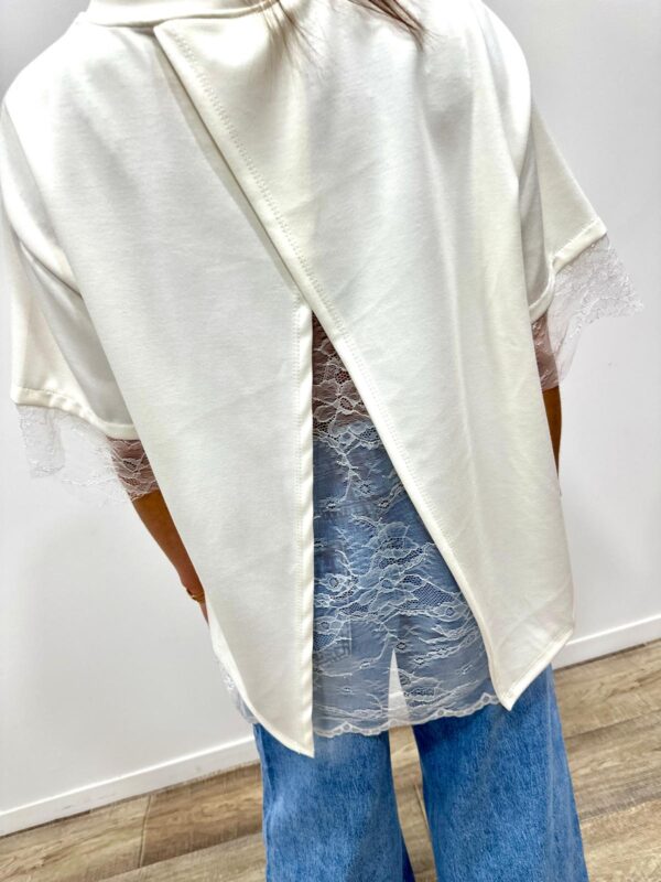 Ce top revisite le t-shirt classique avec une touche ultra féminine grâce à ses délicates finitions en dentelle. Sa coupe fluide et confortable est sublimée par un joli détail ouvert dans le dos qui apporte originalité et élégance. Facile à porter au quotidien pour un look chic et tendance 🤍