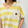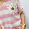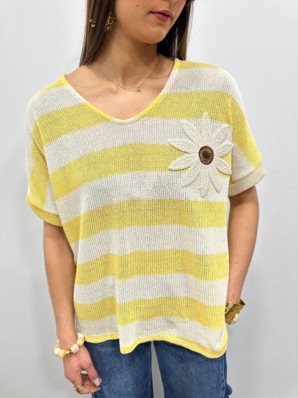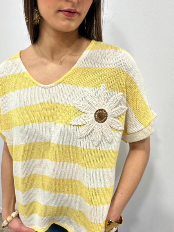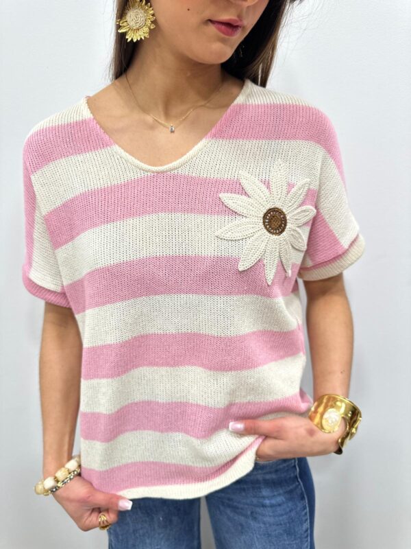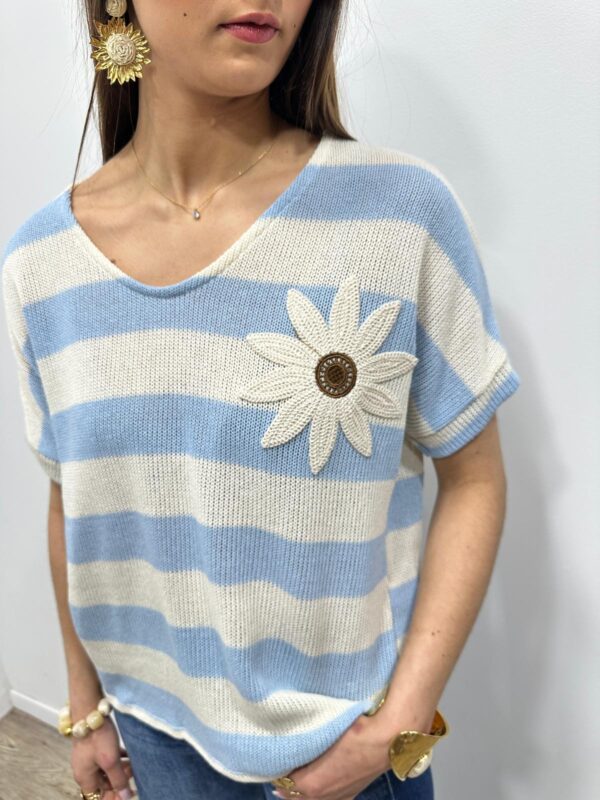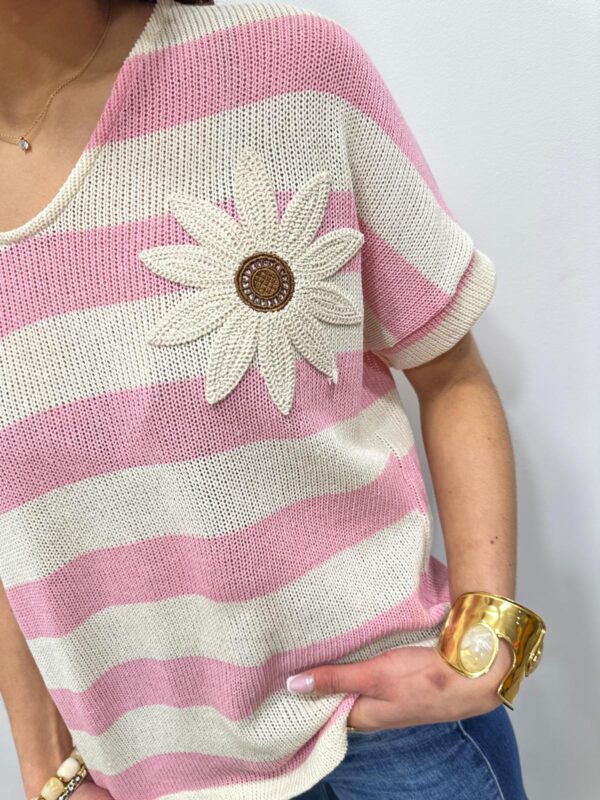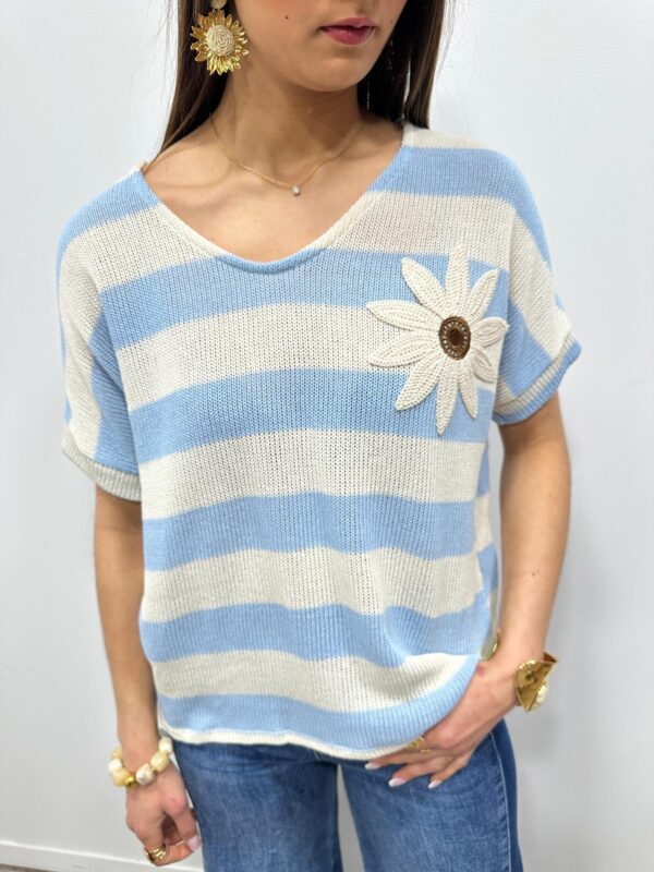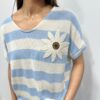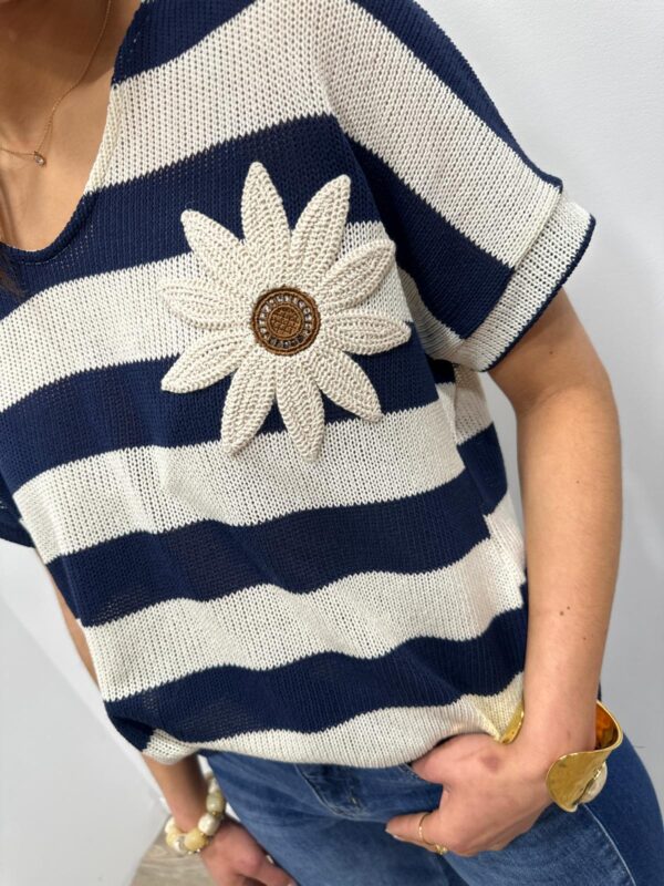 Ce pull en maille légère séduit par son esprit marin revisité avec une touche originale. Ses rayures intemporelles sont sublimées par une jolie fleur en relief qui apporte du caractère et une note féminine au modèle. Sa coupe fluide et confortable offre un tombé naturel et agréable à porter. Une pièce pleine de charme qui associe élégance décontractée et détail délicat 🌼