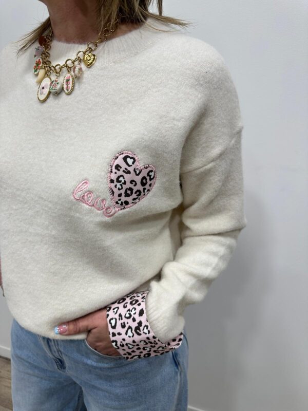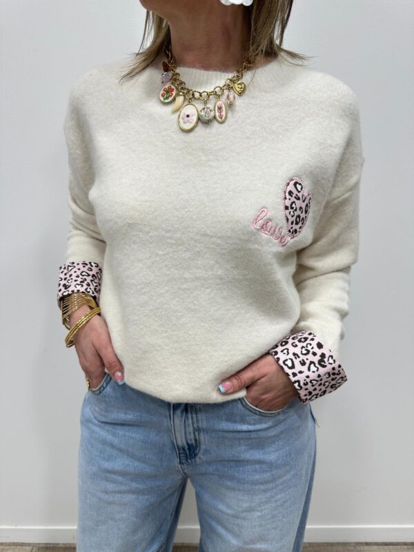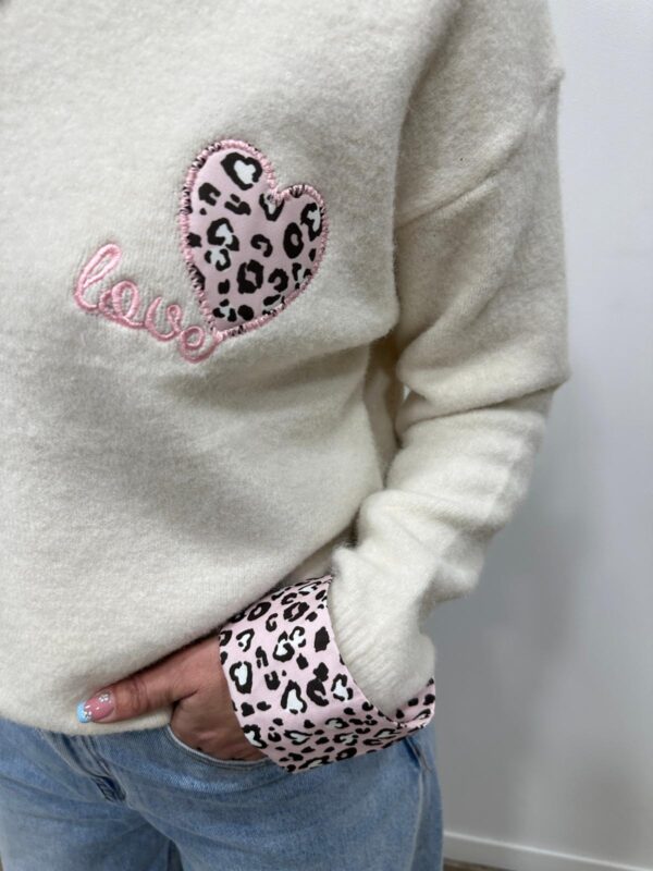 Ce pull doux et élégant se distingue par ses jolis détails féminins qui lui apportent beaucoup de charme. Le cœur brodé avec son imprimé léopard et l’inscription love ajoutent une touche tendance et originale, tandis que les poignets contrastés rappellent ce motif avec style. Une pièce confortable et facile à porter pour un look casual chic plein de douceur 🤍