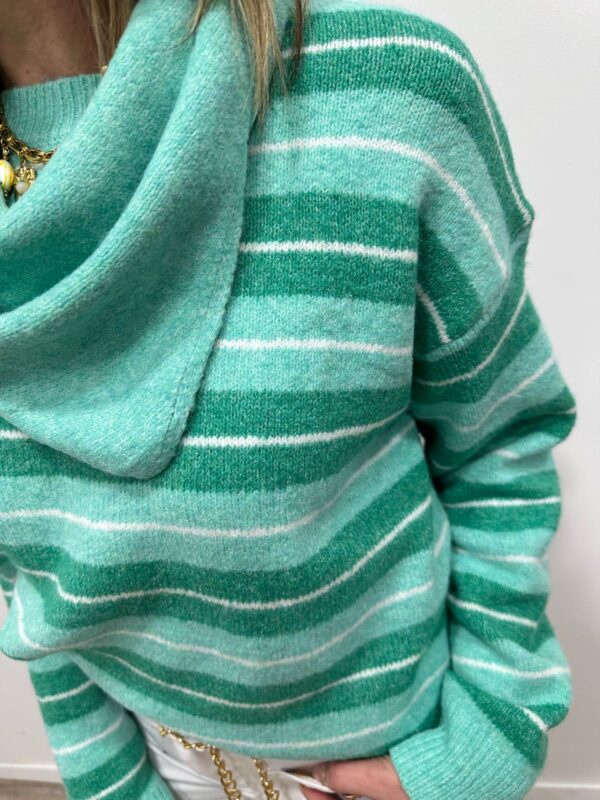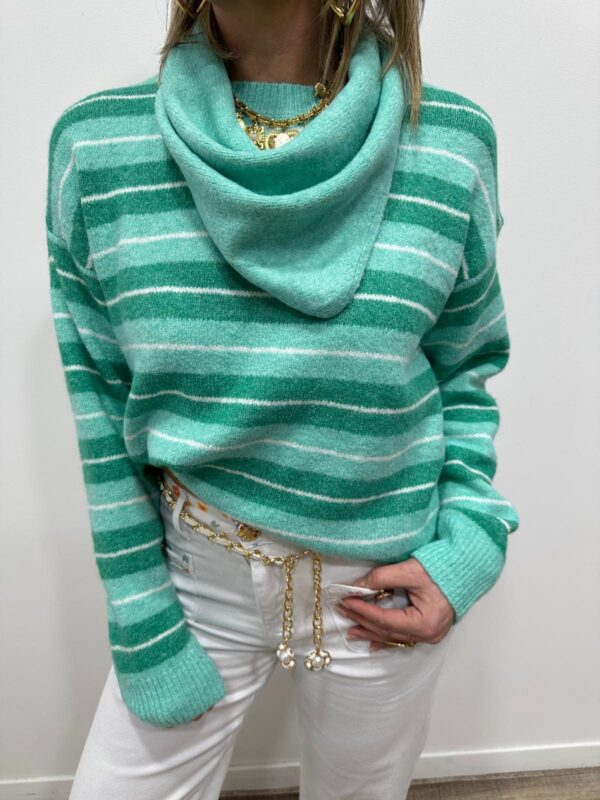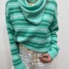 Craquez pour ce pull rayé ultra cosy avec écharpe amovible, une pièce aussi confortable que stylée. Ses rayures vertes dégradées, fraîches et lumineuses, apportent une touche moderne et vitaminée à votre tenue. Le col écharpe souple enveloppe délicatement le cou pour un effet cocooning irrésistible, tandis que sa maille douce et moelleuse assure un confort absolu tout au long de la journée. Ce pull est idéal pour un look casual chic, chaleureux et tendance 💚✨