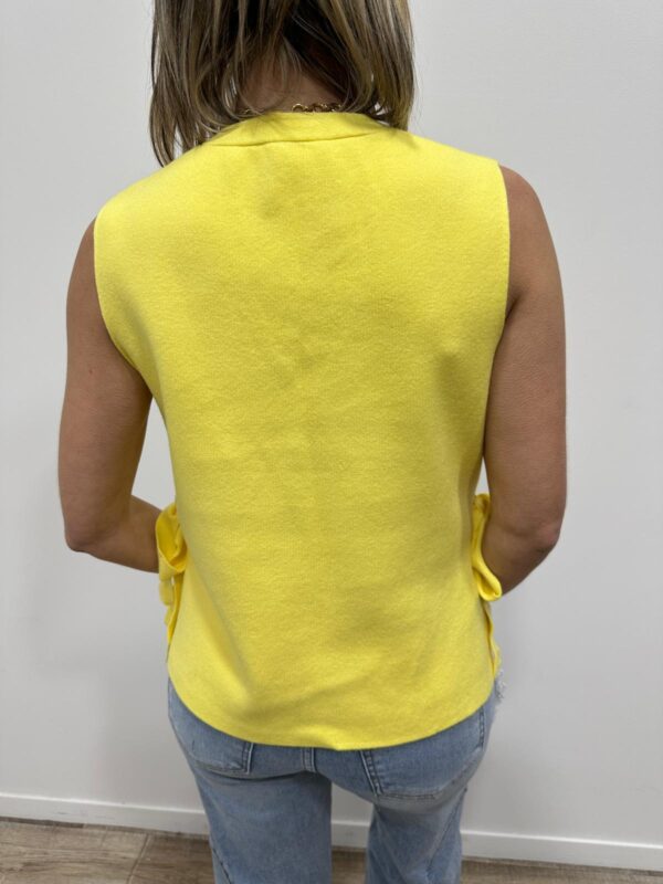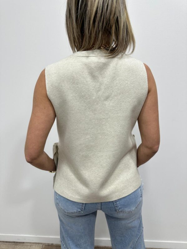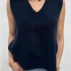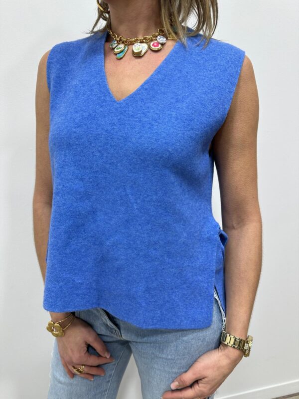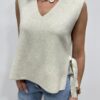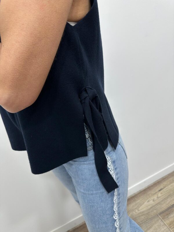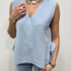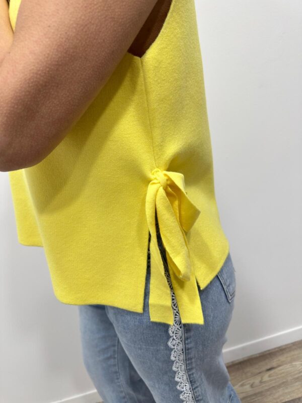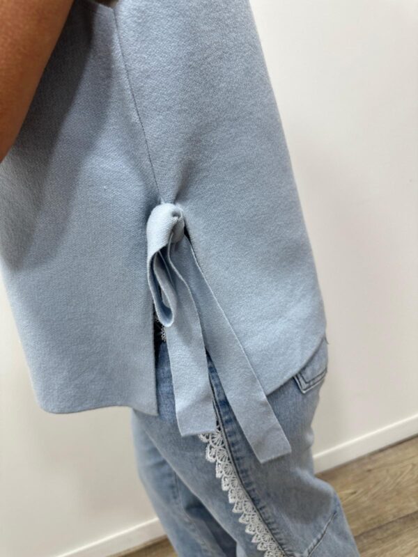 sans manches à l’allure élégante et lumineuse, une pièce aussi simple que raffinée. Son col en V flatteur met délicatement en valeur le décolleté, tandis que sa matière fluide et texturée assure un tombé impeccable. Le petit plus qui fait toute la différence ? Les liens à nouer sur les côtés, qui apportent une touche féminine et originale tout en permettant d’ajuster la coupe selon vos envies. Ce pull est un indispensable du dressing, parfait du matin au soir ✨💛