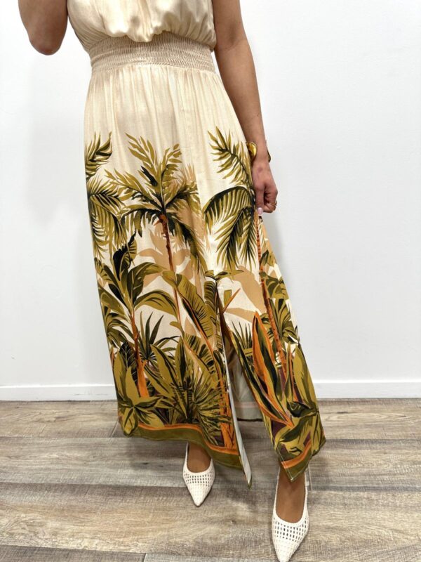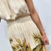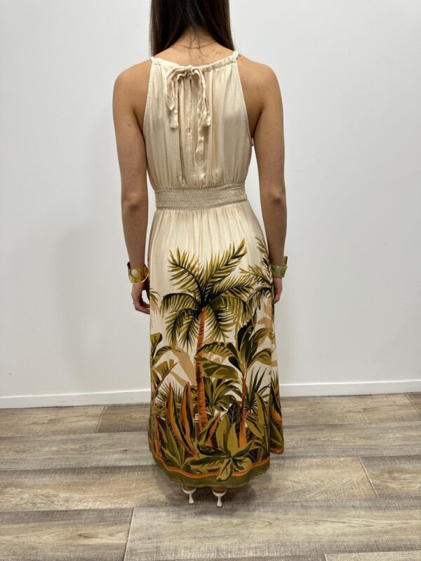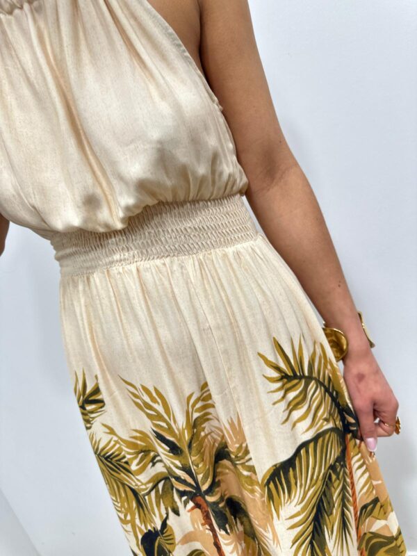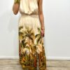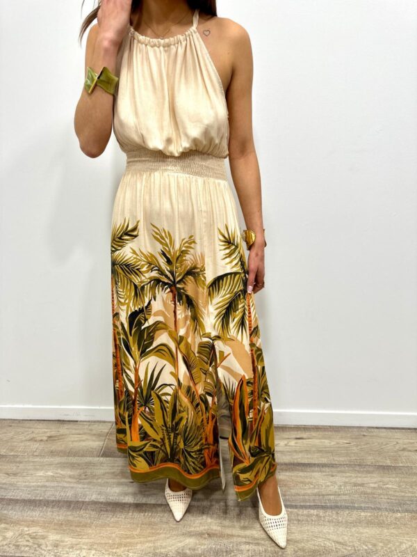 Cette robe longue séduit par son imprimé tropical élégant qui évoque une atmosphère douce et ensoleillée. Son haut fluide à col halter met délicatement en valeur les épaules tandis que la taille smockée souligne la silhouette avec féminité. La matière légère apporte un joli mouvement à chaque pas et renforce l’allure aérienne du modèle. Une pièce pleine de charme qui attire le regard par ses couleurs naturelles et son imprimé végétal raffiné 🌿