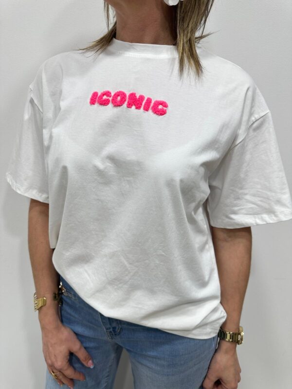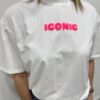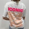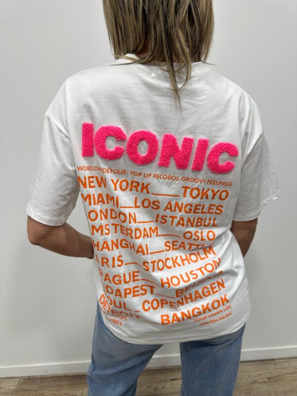 Ce tee-shirt blanc au style moderne et décontracté apporte une touche fun à votre tenue. Son inscription ICONIC en relief rose fluo attire immédiatement le regard, tandis que l’imprimé graphique au dos avec les grandes villes du monde lui donne un esprit urbain et tendance. Parfait pour un look casual stylé au quotidien 💗