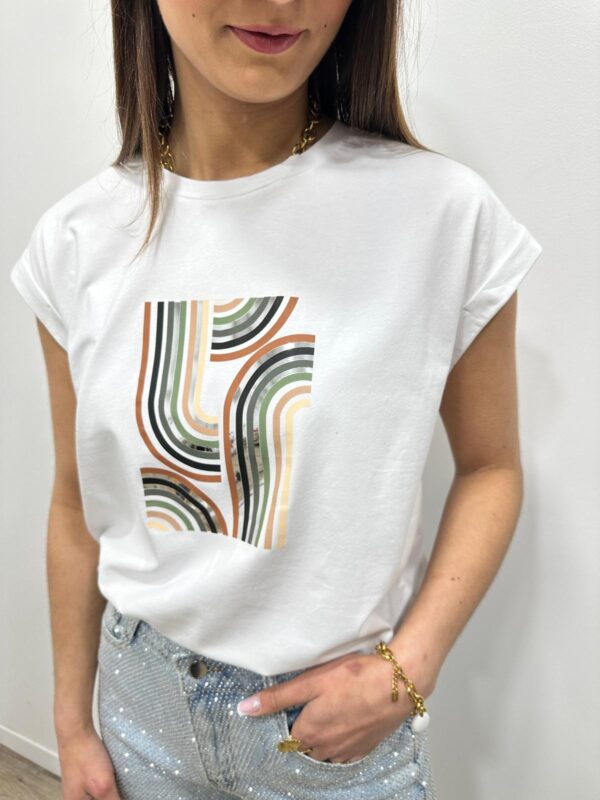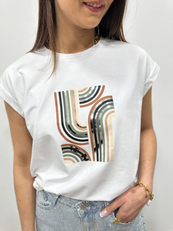 Ce tee-shirt se distingue par son motif graphique moderne aux reflets métallisés qui apporte une touche élégante et lumineuse. Sa coupe confortable et sa matière douce offrent un tombé naturel très agréable à porter. Le design géométrique donne du caractère au modèle tout en restant facile à adopter au quotidien. Une pièce tendance qui apporte une note chic et contemporaine à la silhouette.
