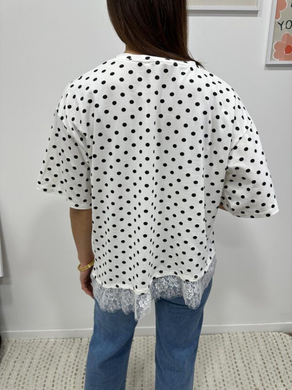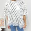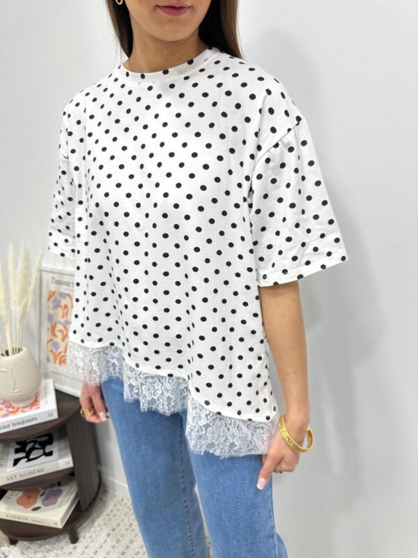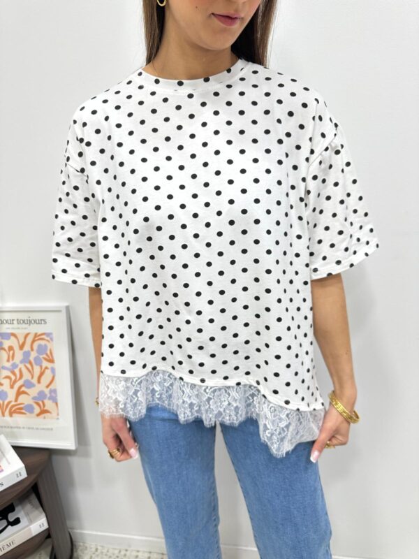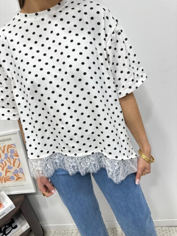 Le tee-shirt revisité ultra féminin 🤍 Une pièce originale qui mixe l’esprit casual du tee-shirt à pois avec une délicate finition en dentelle pour une touche chic et élégante. On adore ce détail subtil en bas qui fait toute la différence ✨ Parfait pour upgrader un look simple en un clin d’œil.
