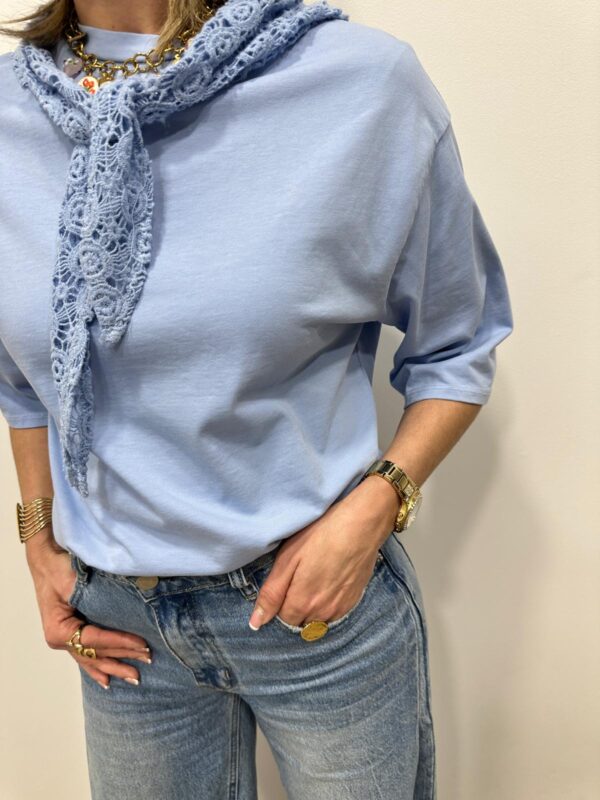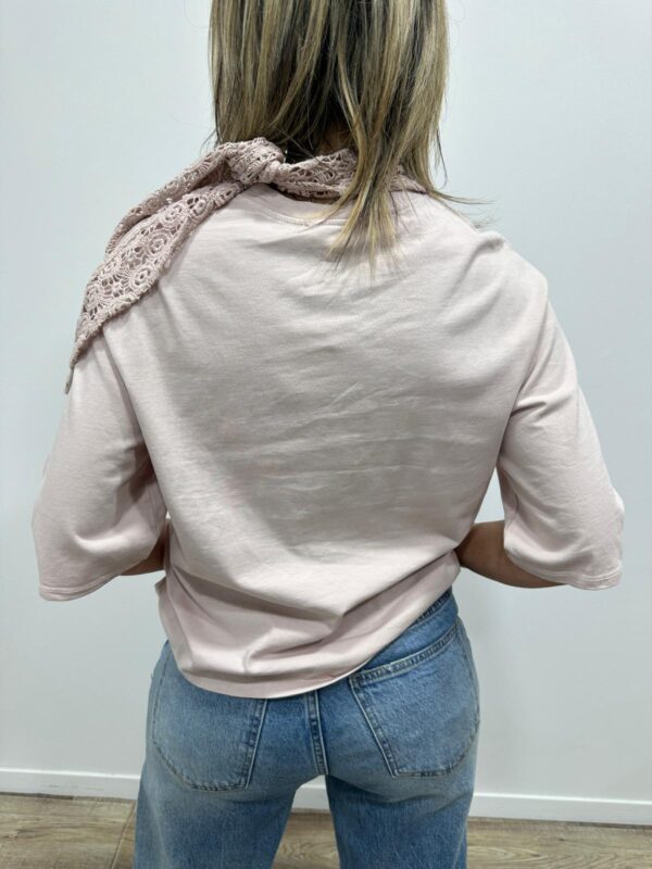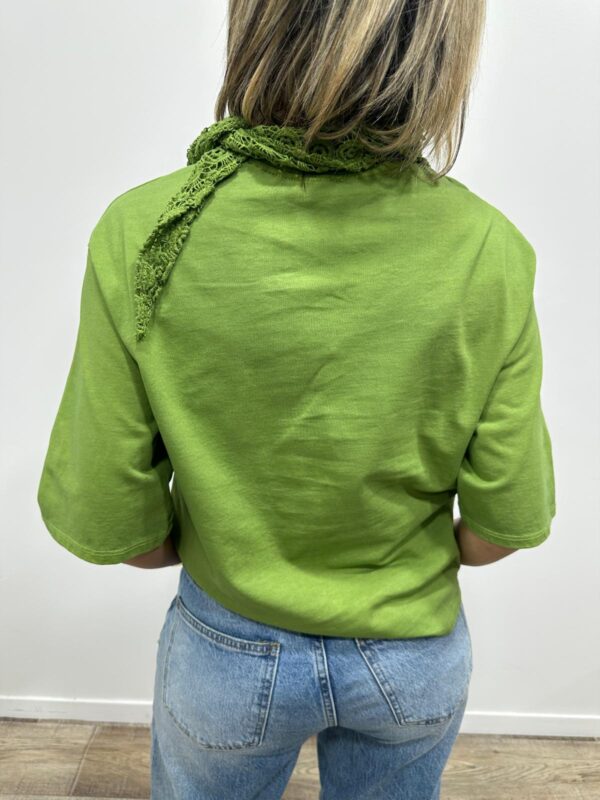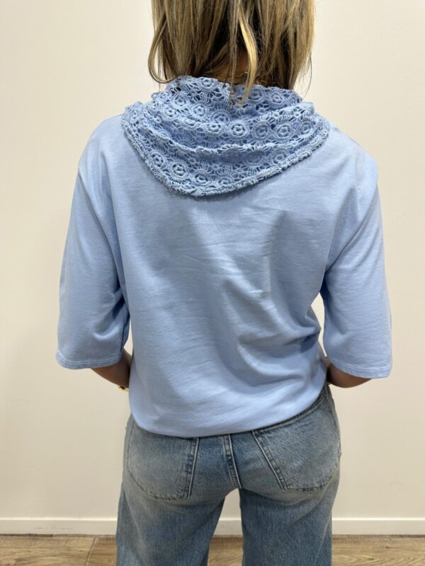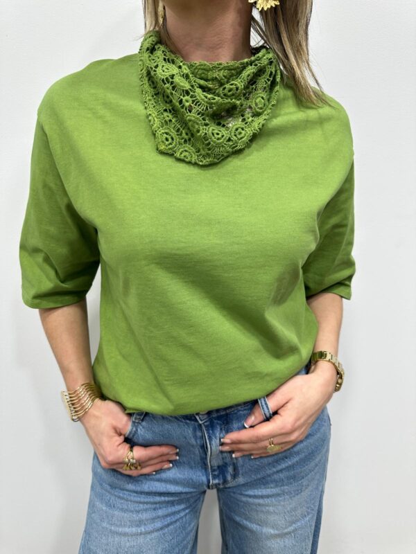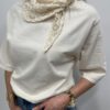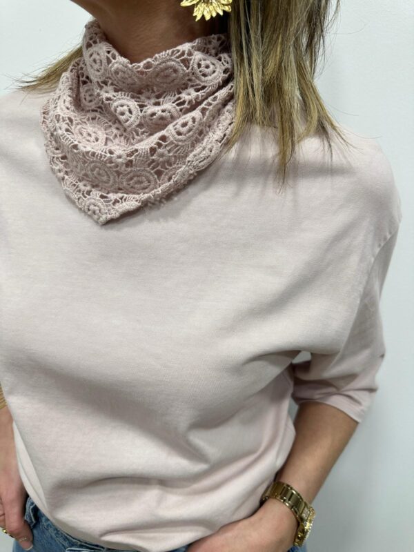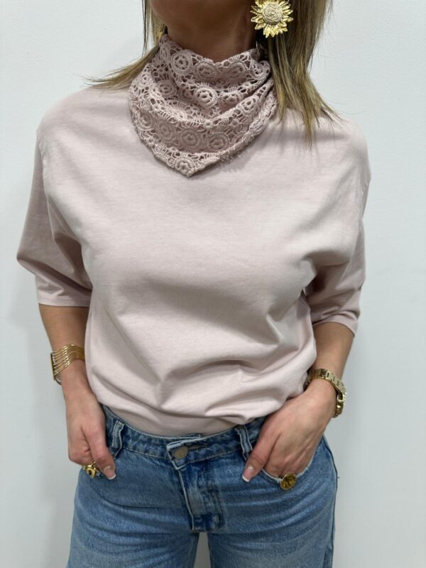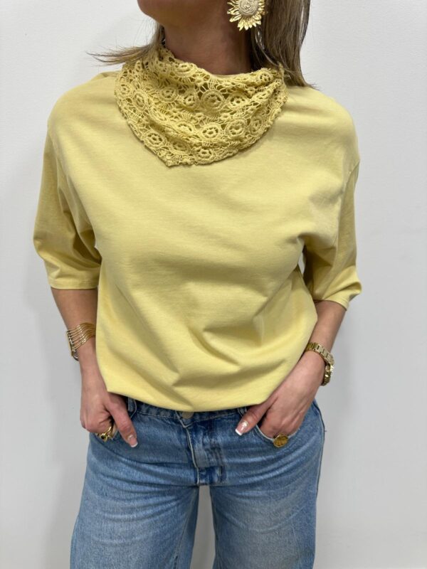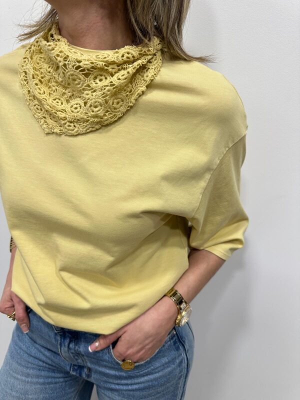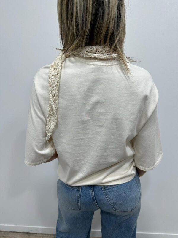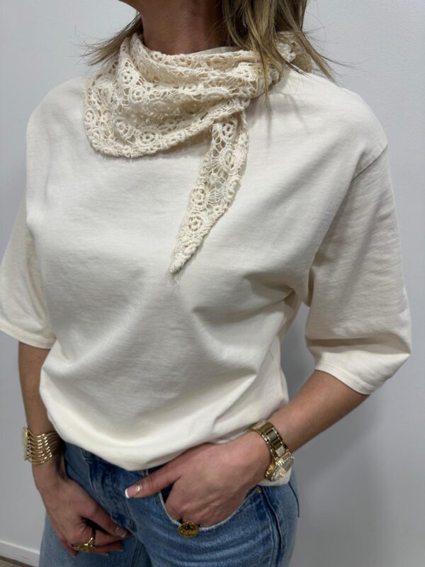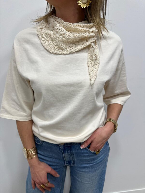 Apportez une touche de douceur et de féminité à votre tenue avec ce tee-shirt élégant au col travaillé. Son magnifique col en dentelle délicatement ajourée apporte une note romantique et raffinée qui sublime instantanément la silhouette. Sa coupe fluide et confortable en fait une pièce facile à porter au quotidien.