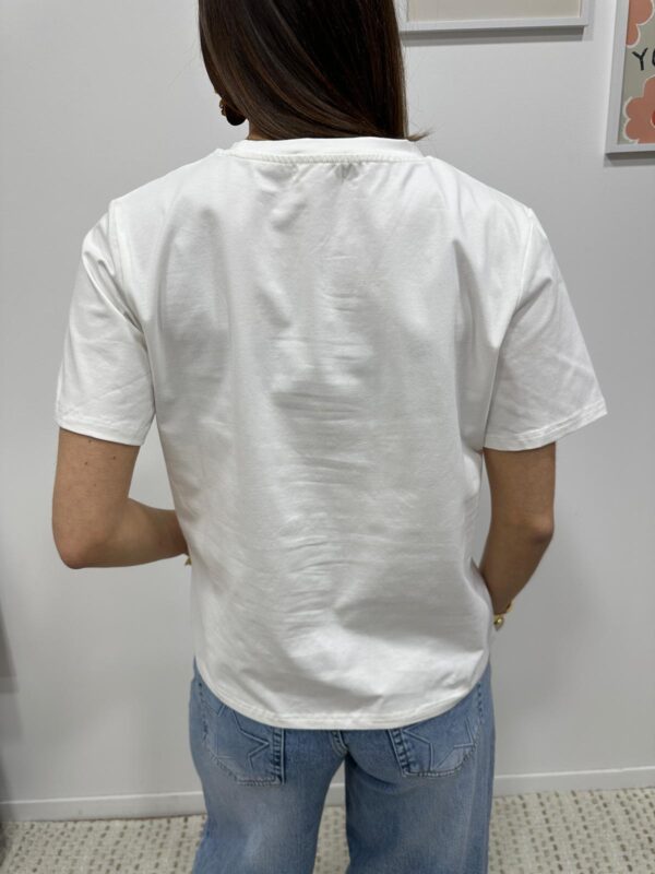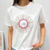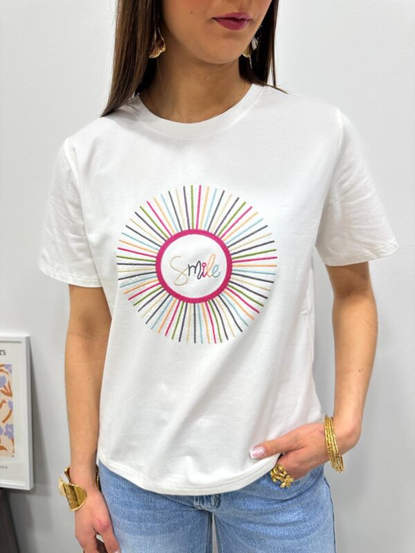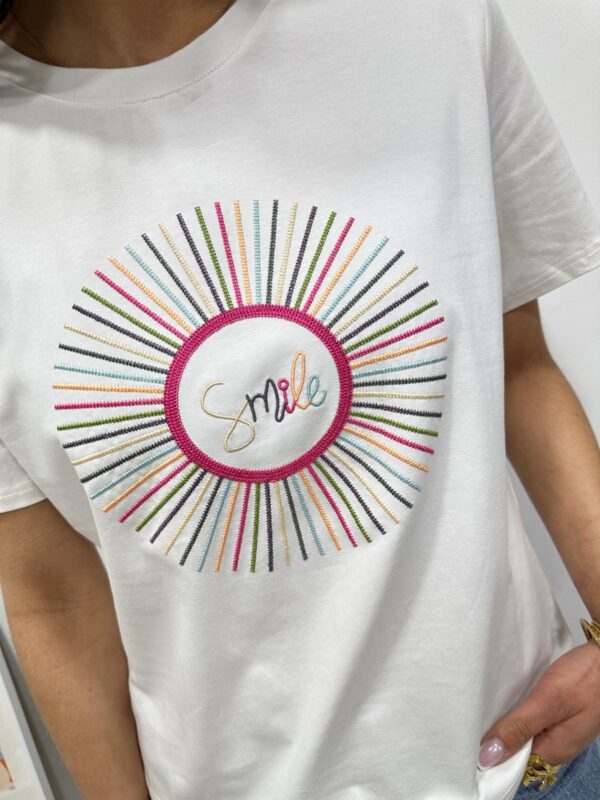 Le t-shirt qui respire la bonne humeur ☀️ Avec son motif brodé multicolore et son message “Smile”, il apporte une touche lumineuse et positive à tous vos looks. Facile à porter au quotidien, il se mixe parfaitement avec un jean pour un style casual chic. Un basique revisité plein de pep’s 💖