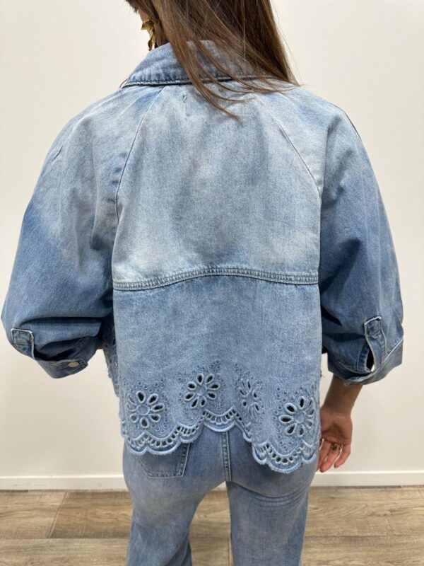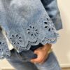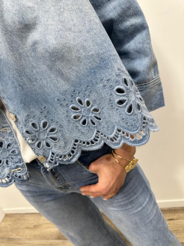 Apportez une touche romantique à votre dressing avec cette veste en jean revisitée. Son bas festonné en broderie anglaise lui donne un charme unique et féminin, tout en conservant l’esprit casual du denim. Facile à associer elle sublime vos looks avec originalité.