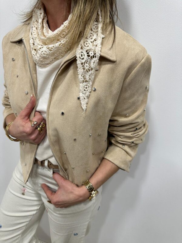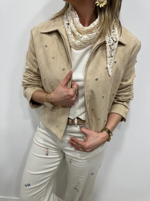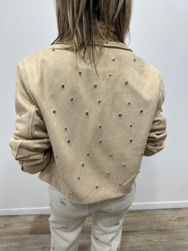 Apportez une touche chic et originale à votre tenue avec cette veste élégante au style moderne. Son effet suédine doux et raffiné est sublimé par de délicats clous décoratifs qui apportent du caractère tout en restant subtils. Sa coupe structurée et son col classique en font une pièce facile à associer, parfaite pour compléter un look casual chic.