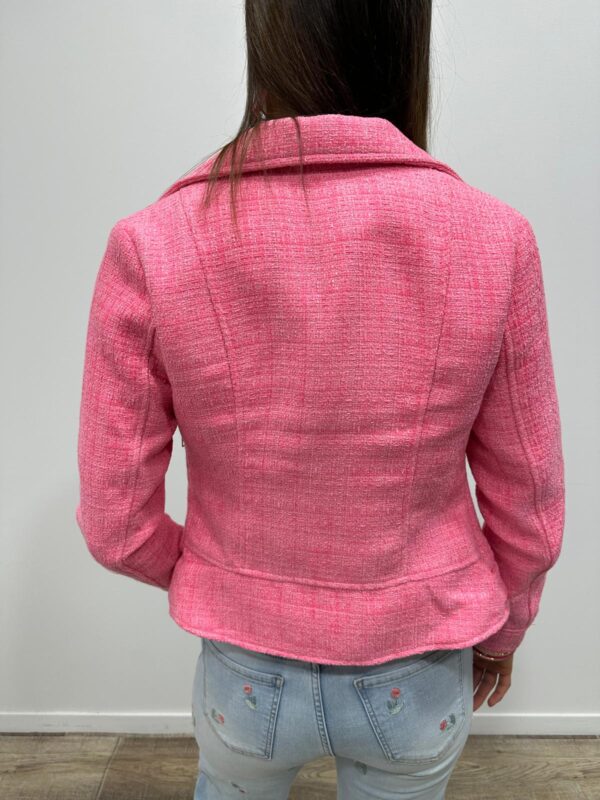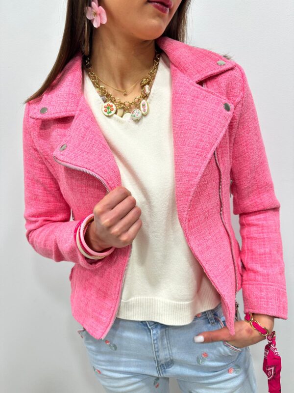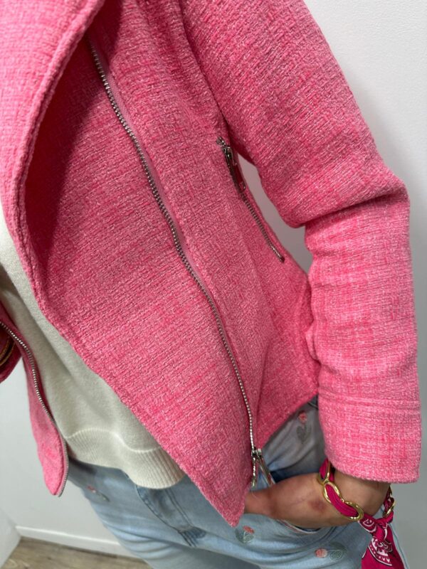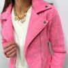Craquez pour cette veste courte rose au charme irrésistible, véritable pièce coup de cœur qui illumine instantanément la silhouette. Son allure inspirée du perfecto revisité apporte une touche chic et moderne, tandis que sa matière texturée façon tweed lui confère une élégance raffinée. Facile à associer, elle sublime aussi bien un look casual qu’une tenue plus habillée. Une veste féminine et tendance, idéale pour rehausser vos looks de saison avec style.