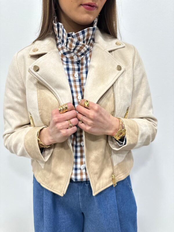 Craquez pour cette veste au style chic et intemporel, inspirée du perfecto, qui apporte instantanément du caractère à vos tenues 💫🤍 Sa matière douce effet suédine séduit par son toucher agréable et son rendu élégant, tandis que ses détails zippés et boutons dorés ajoutent une touche sophistiquée. Facile à associer pour un look casual chic parfaitement maîtrisé. Une pièce incontournable du dressing, idéale pour la mi-saison ✨🌿
