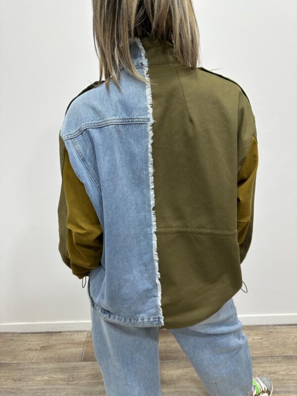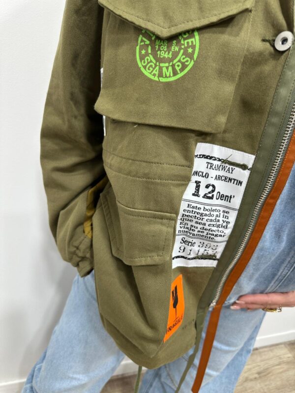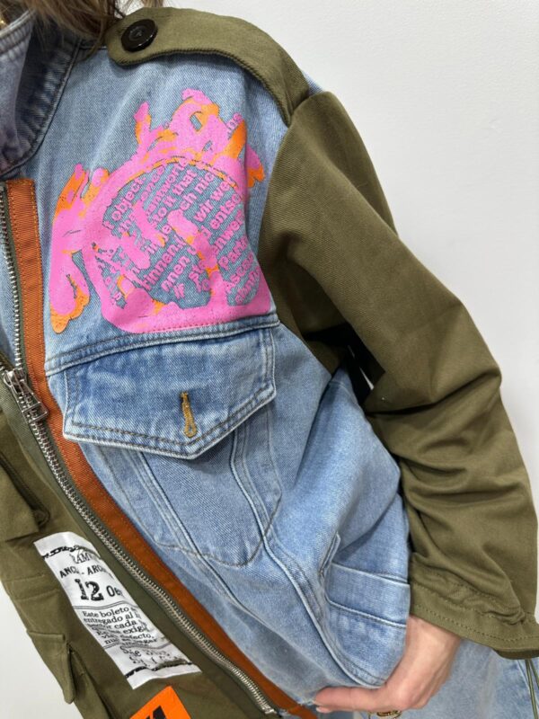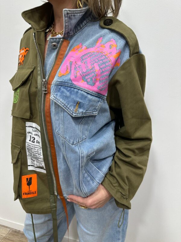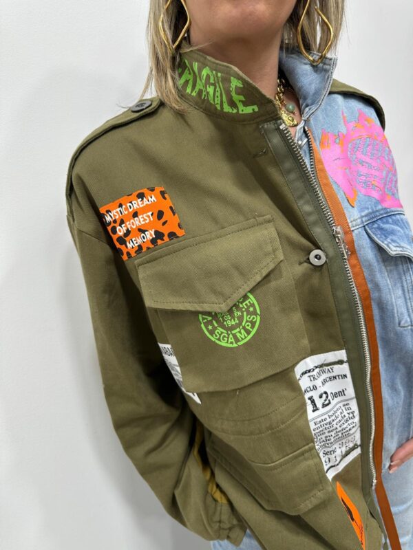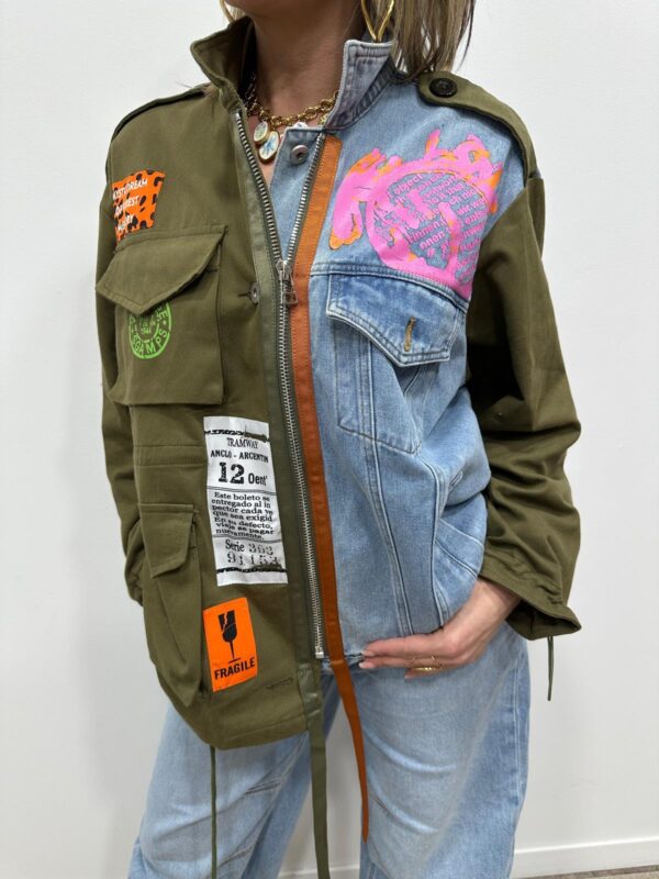 Affirmez votre style avec cette veste ultra originale au mix audacieux et tendance. Son assemblage de toile kaki esprit militaire et de denim clair lui donne un caractère fort, rehaussé par une multitude de patchs graphiques et colorés pour un look résolument urbain et unique. Chaque détail apporte une touche arty et moderne, faisant de cette veste une véritable pièce coup de cœur. À porter ouverte ou fermée elle suffit à elle seule à booster une tenue ✨