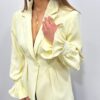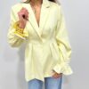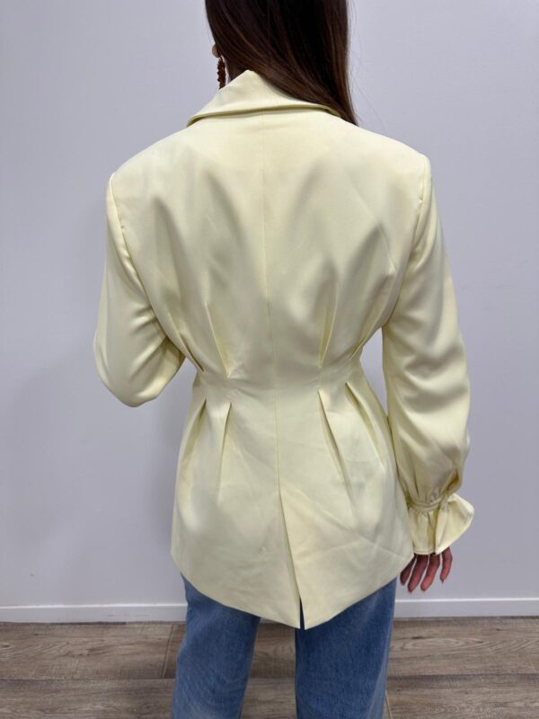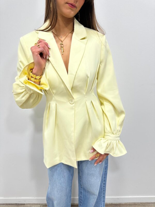 Craquez pour cette veste élégante au style chic et féminin. Sa coupe structurée met en valeur la silhouette grâce à ses jolis plis à la taille qui apportent une touche raffinée et moderne. Sa couleur douce et lumineuse illumine instantanément la tenue, tandis que ses manches légèrement bouffantes avec poignets volantés ajoutent une note sophistiquée. ✨